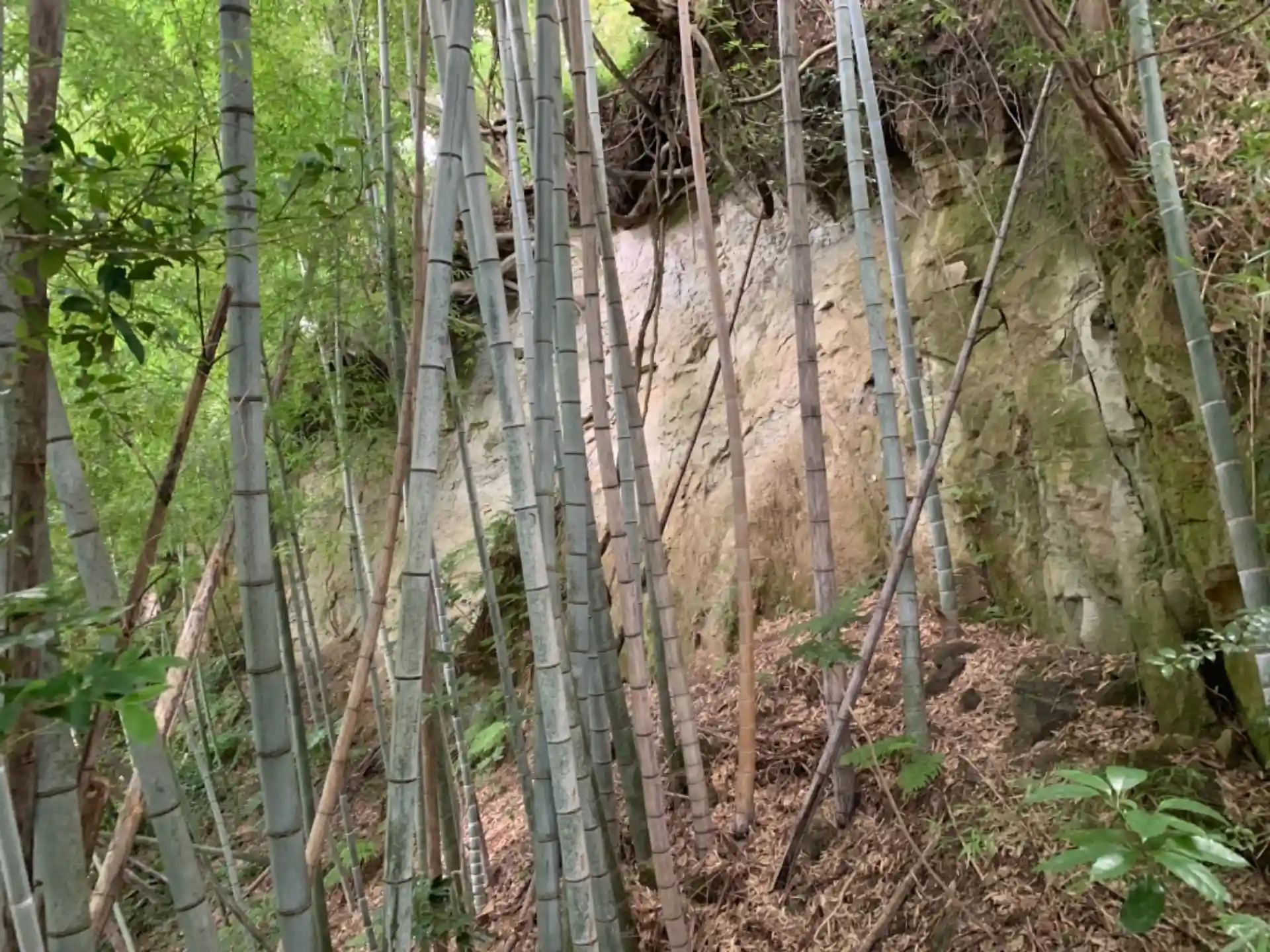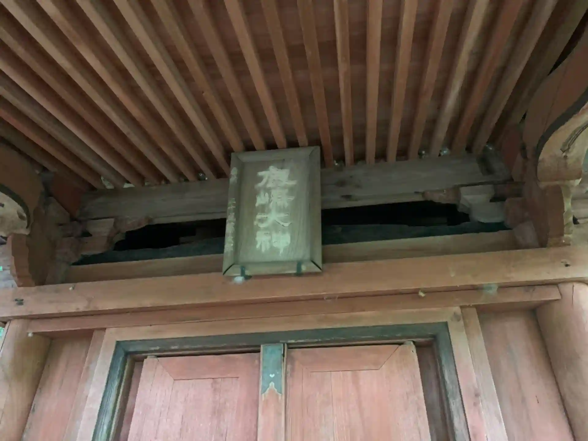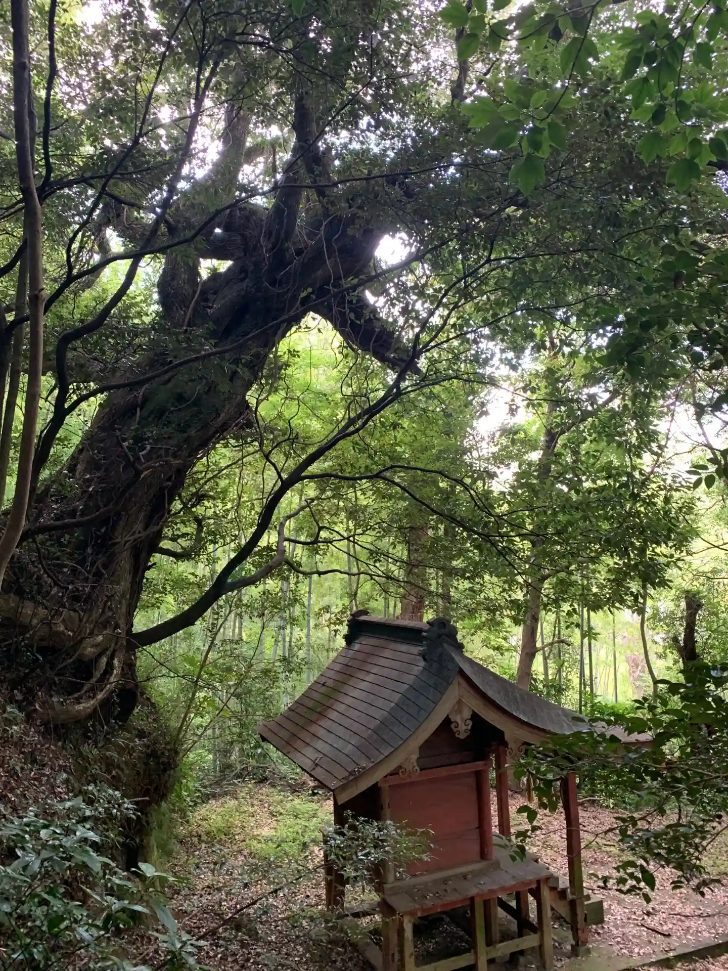 民家の隙間から入れる神社。お社の後ろの木が印象的でした。