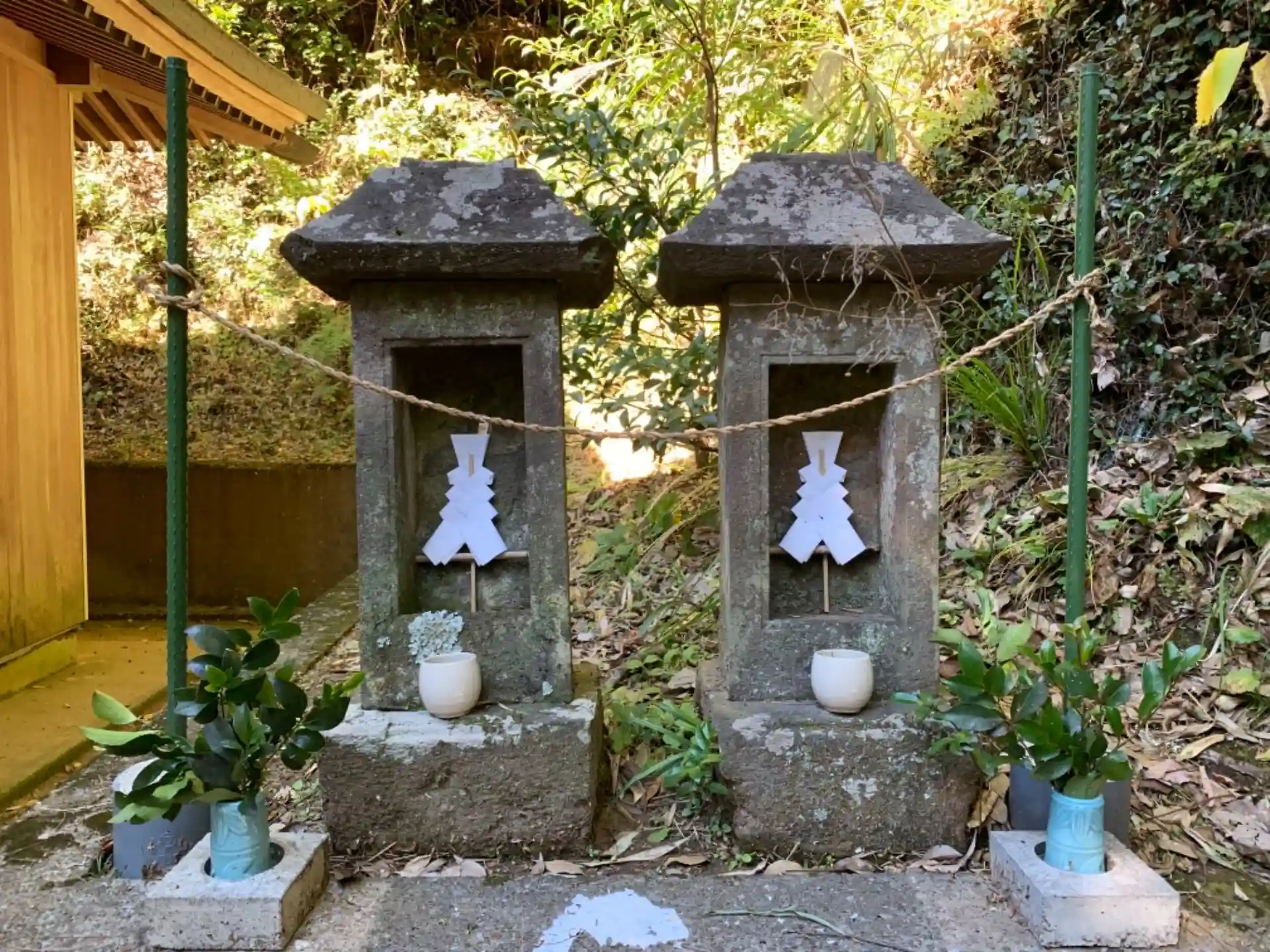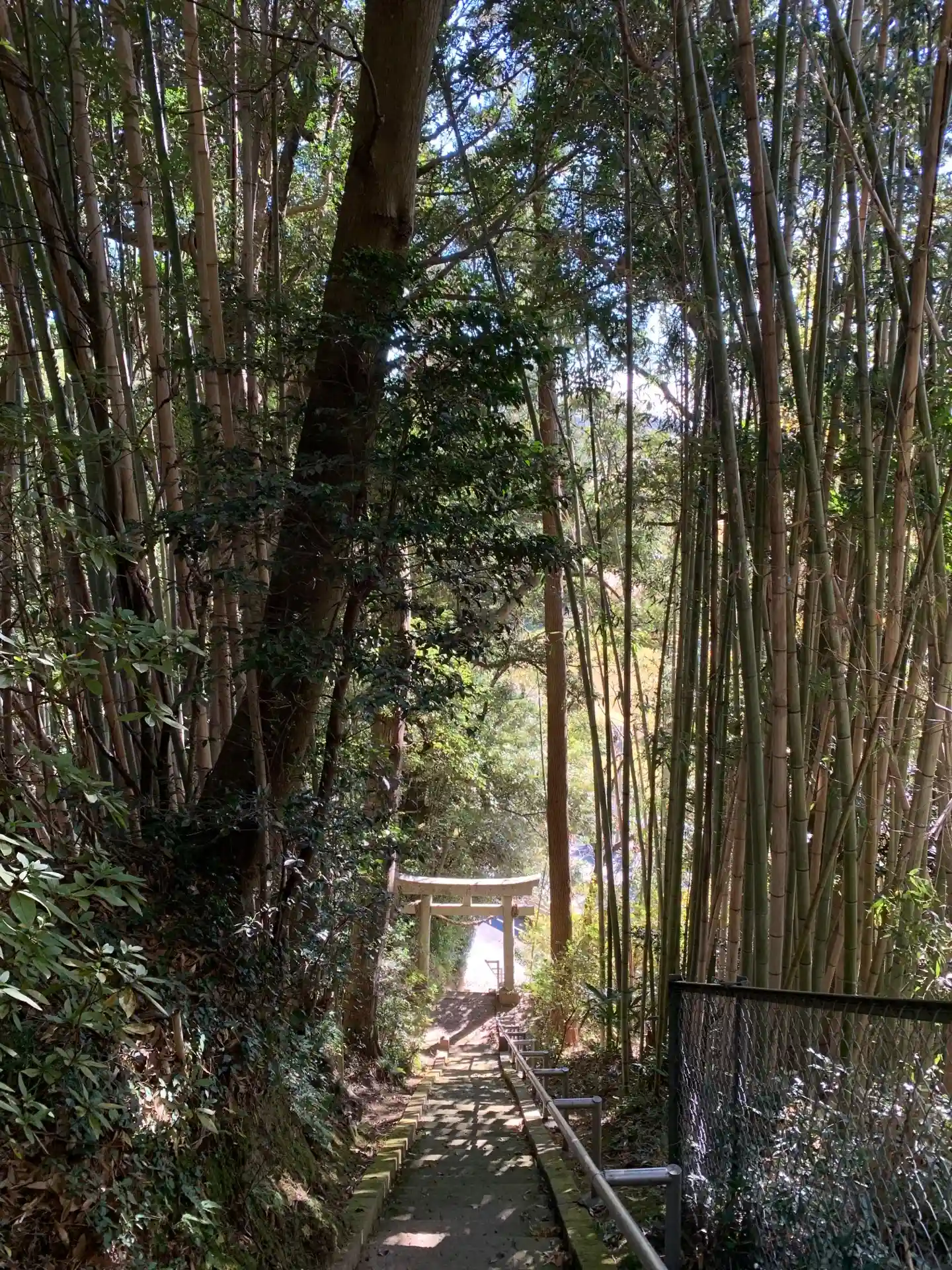 森の中の神社。木漏れ日が綺麗でした。境内からどこかへ続く道が伸びていました。