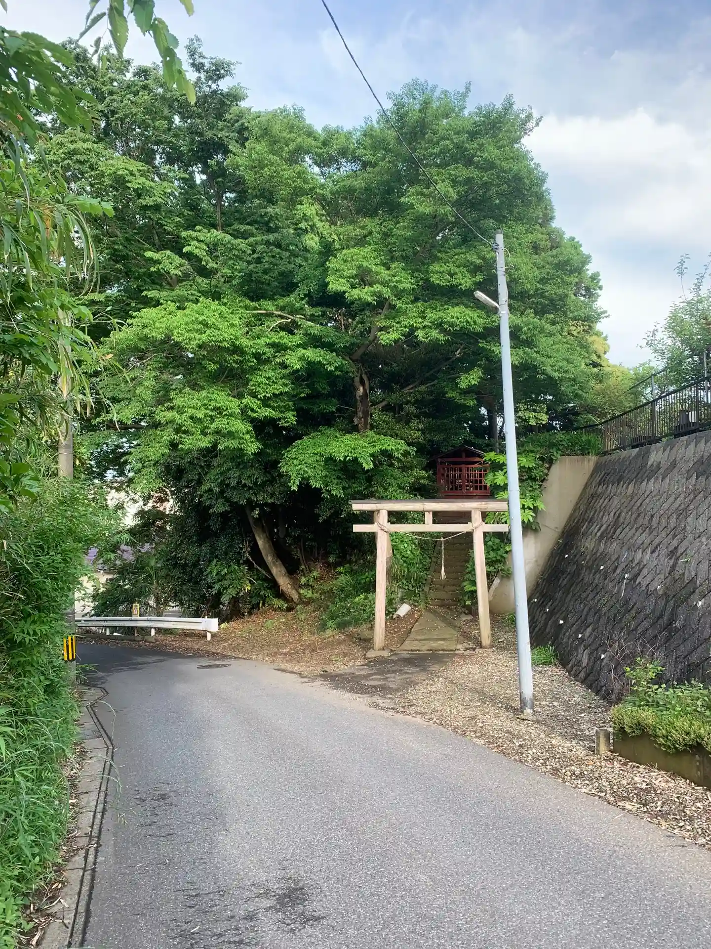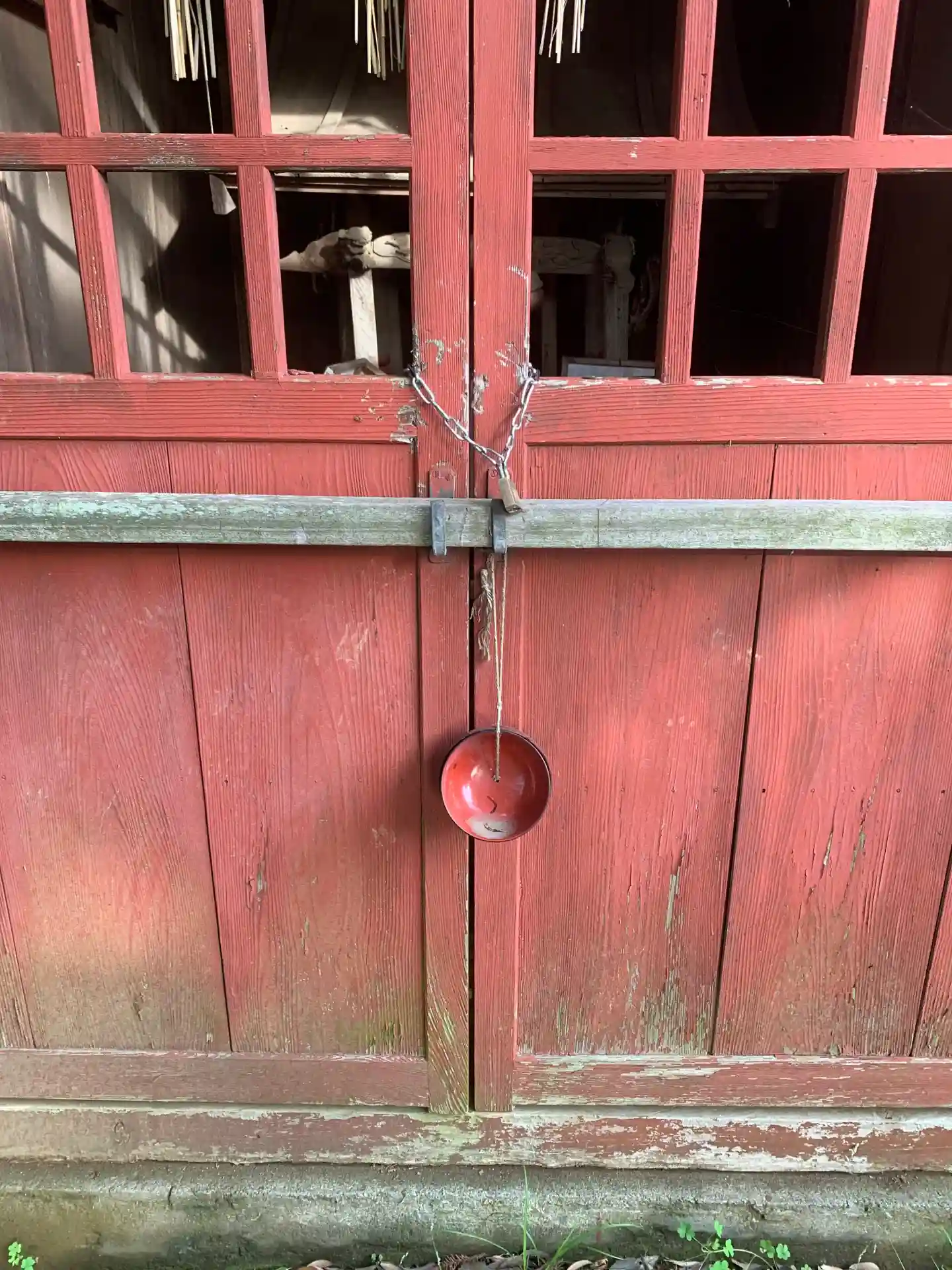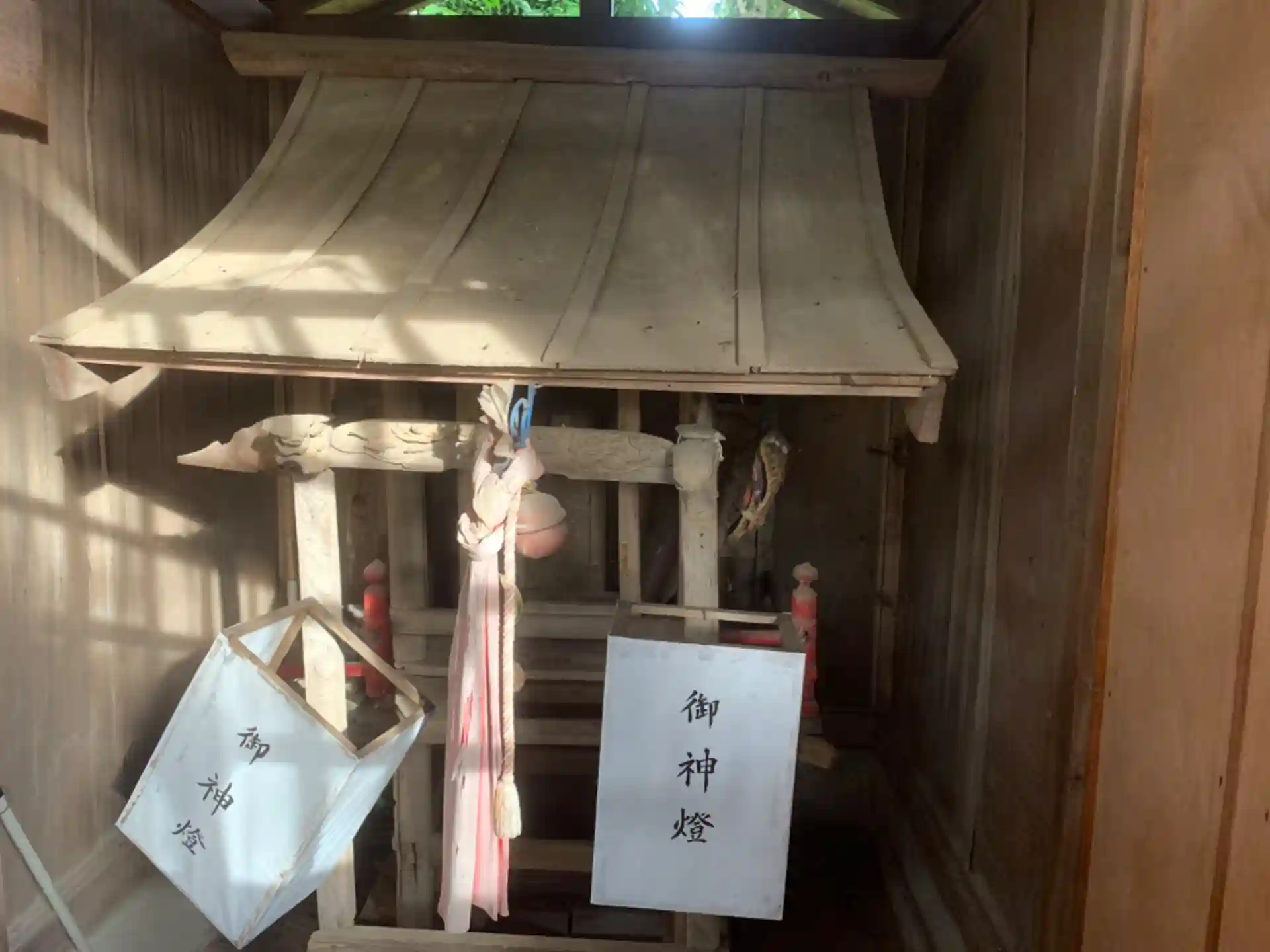道路に面した小さな神社。祠の中には草鞋、扉には茶碗がぶら下がっていました。