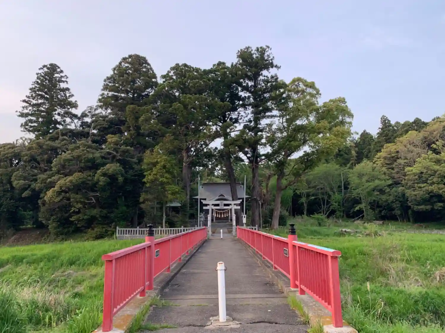 砂利敷の農道を進むと現れる突然赤い橋と鎮守の森。