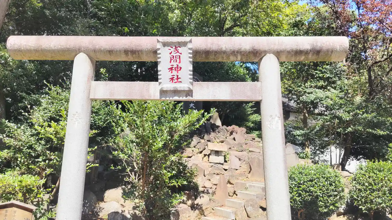 参道の左側、手水舎の右奥にある<浅間神社>。富士山を模した山の頂に立つと、富士山登頂と同じ御利益があるとのこと。