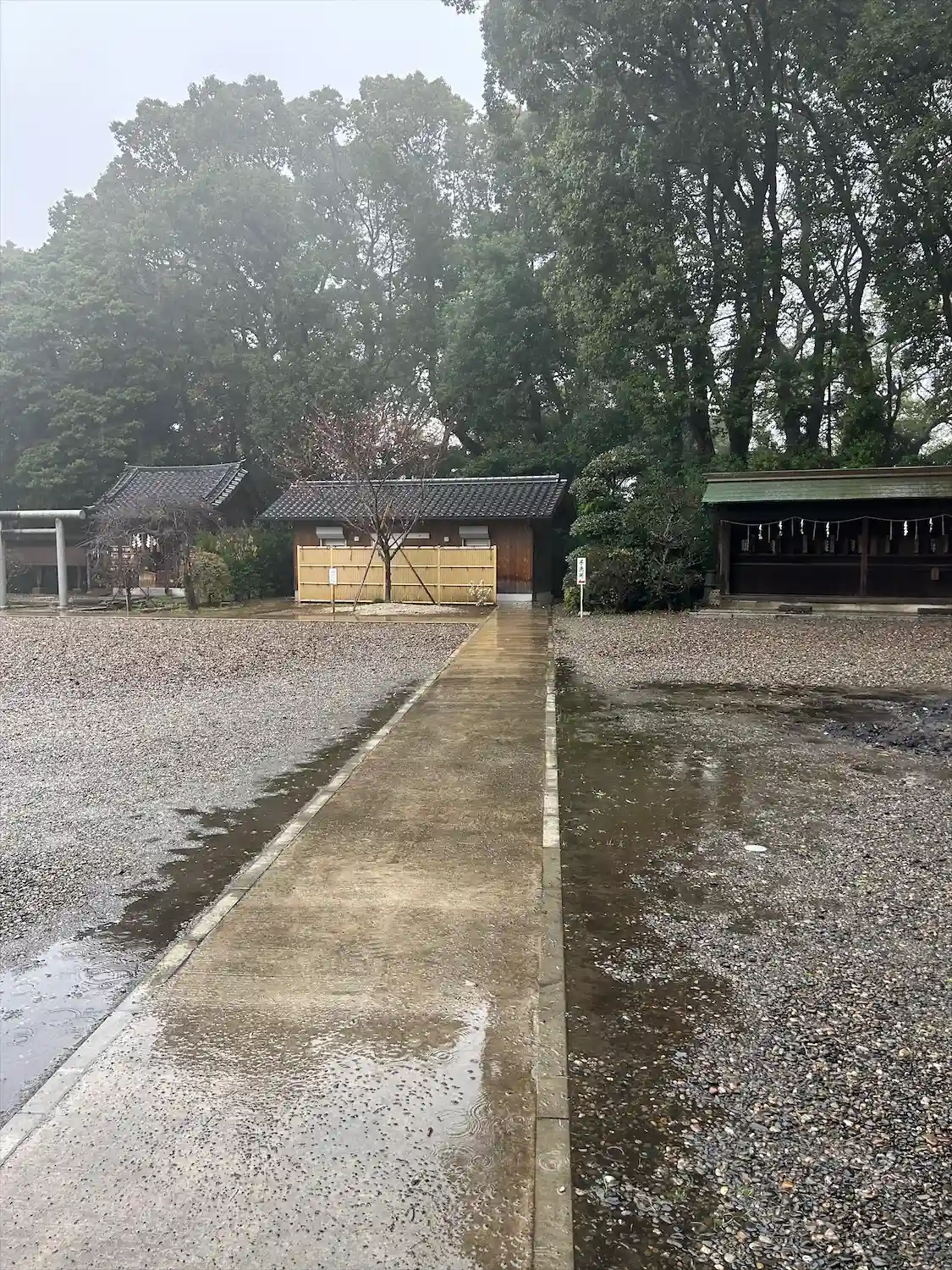 神門をくぐったところ。かなり広々とした境内。 でも、何か変? 参道が社殿の正面に通じていない?