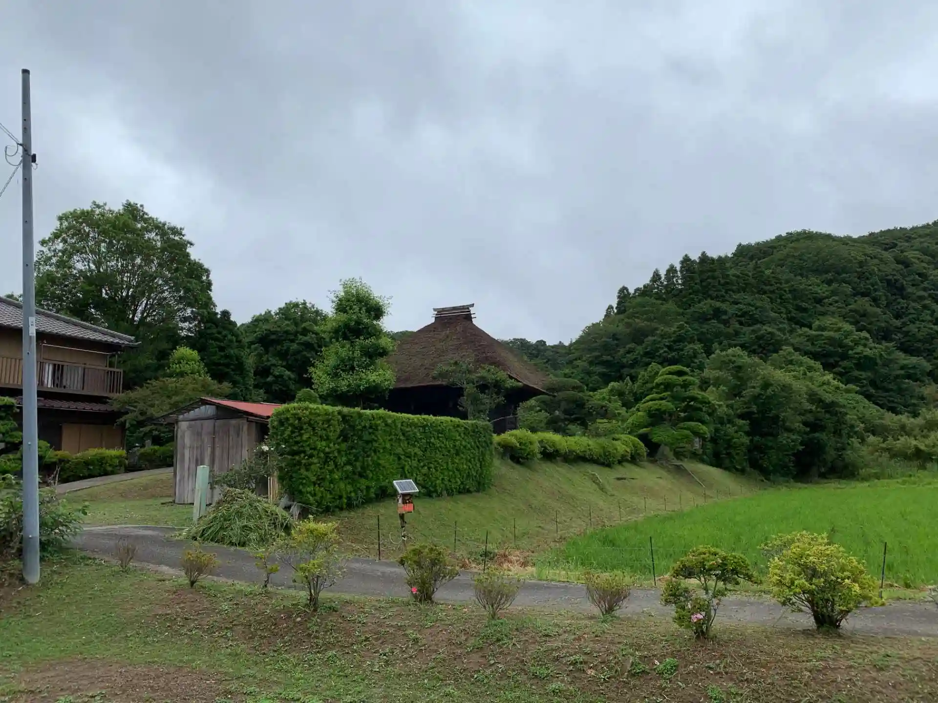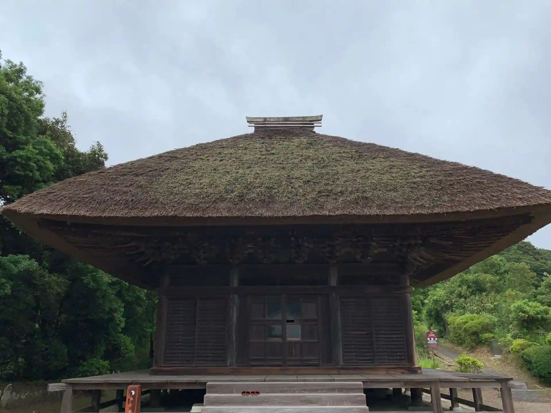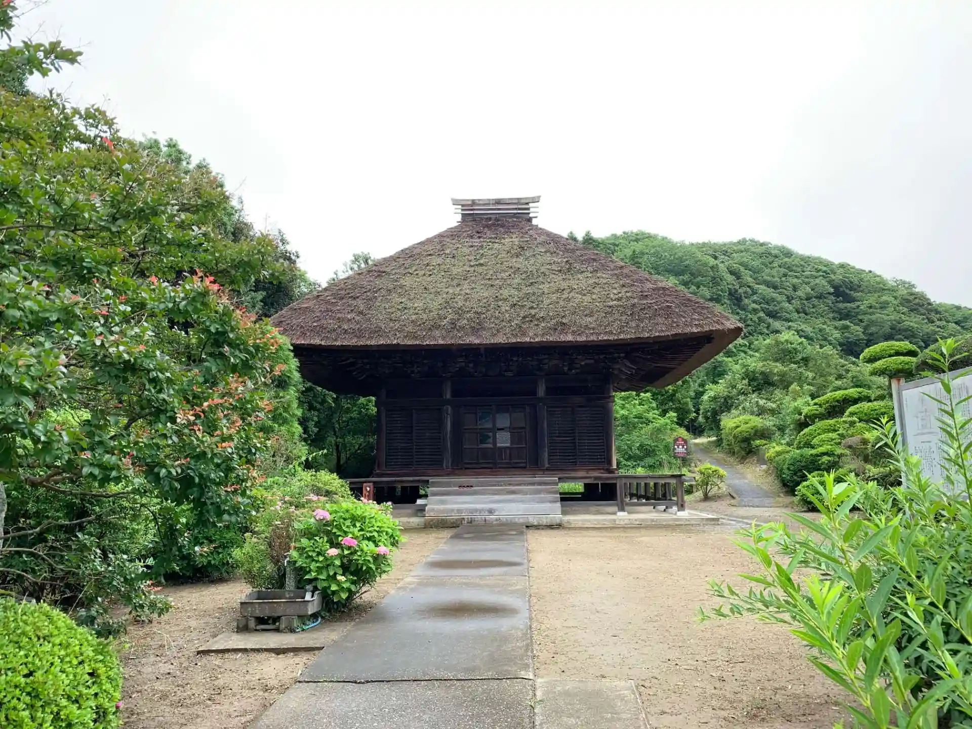 国道沿いにひっそり存在する茅葺きの寺院。