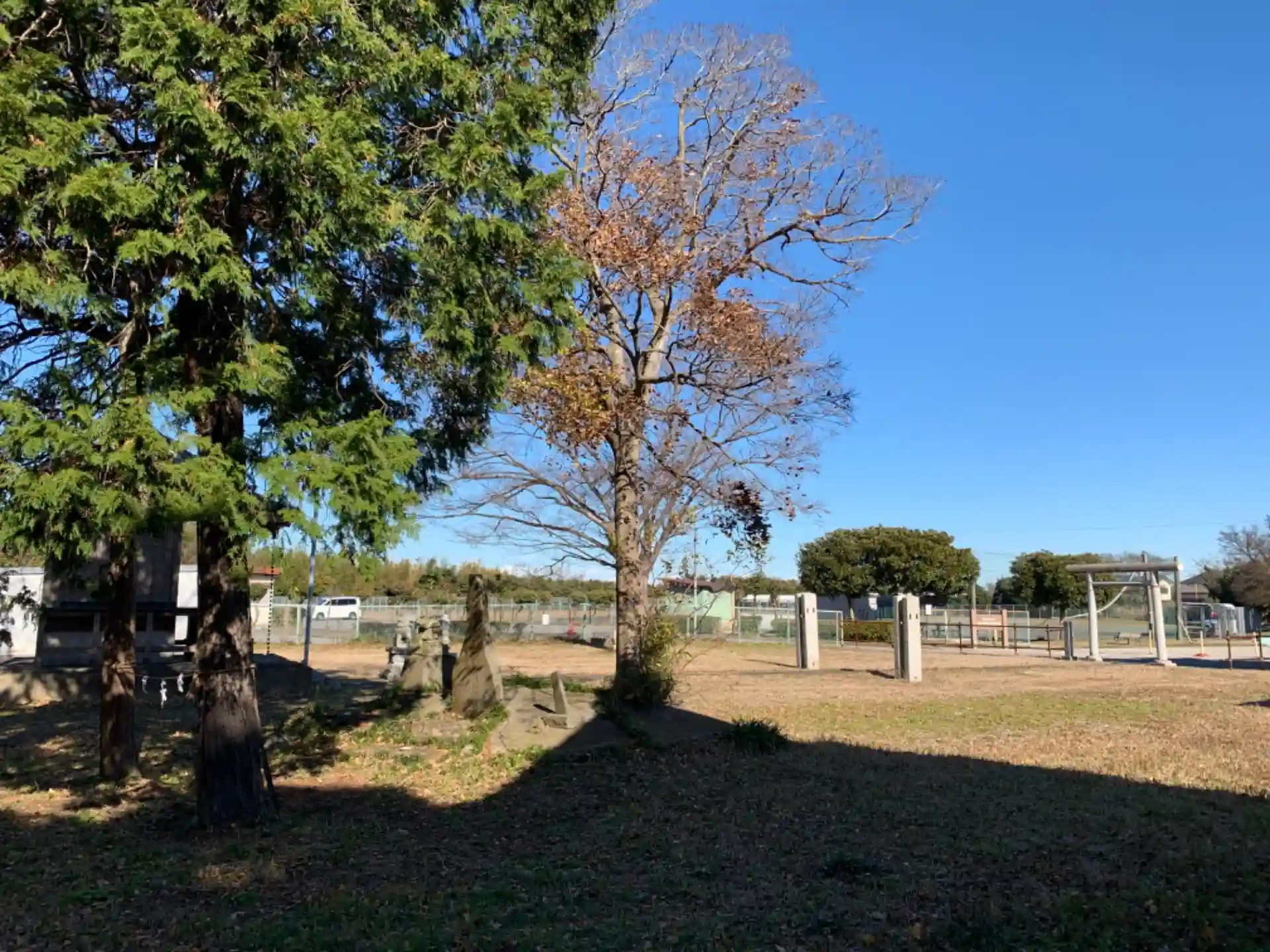 運動場駐車場の隣にある小さな神社。境内は広いです。隣の木の根元には日清日露戦争で亡くなった馬を慰霊する石碑がありました。