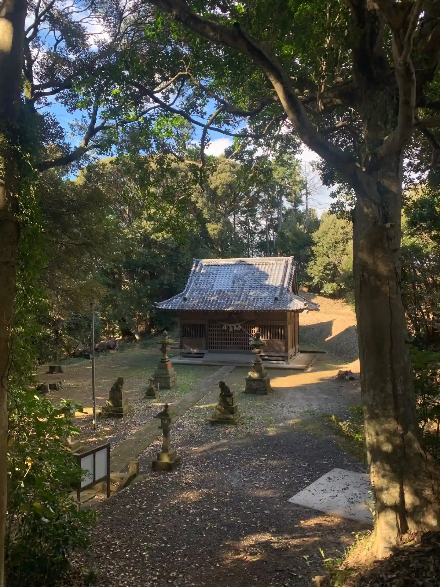丘陵を巻くように登ると広い境内。社殿は大きめで、正面の獅噛彫刻が天狗のうちわでした。地名の「烏」と深い繋がりがあることが伺えます。