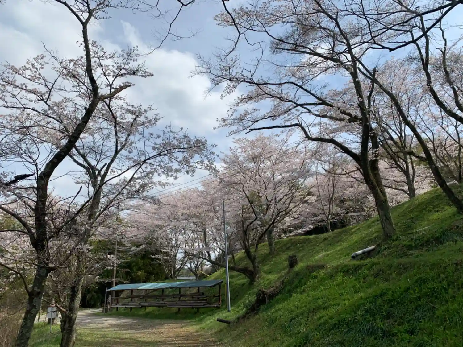 4月初めに行きましたが、段々になった土地に桜が咲き乱れていました。空き地には机と椅子が置いてあり、地元の方の憩いの場になっていることが想像できます。