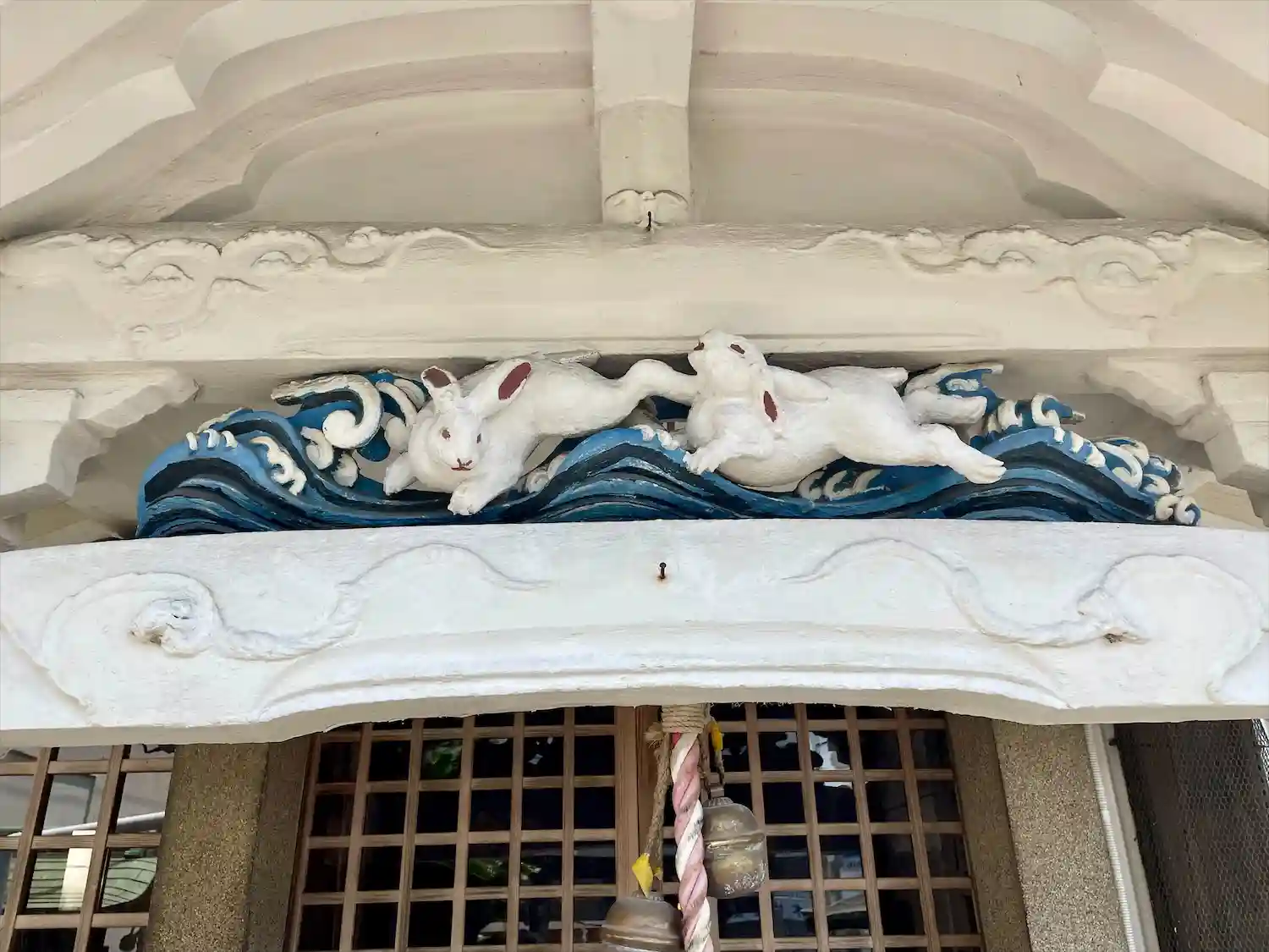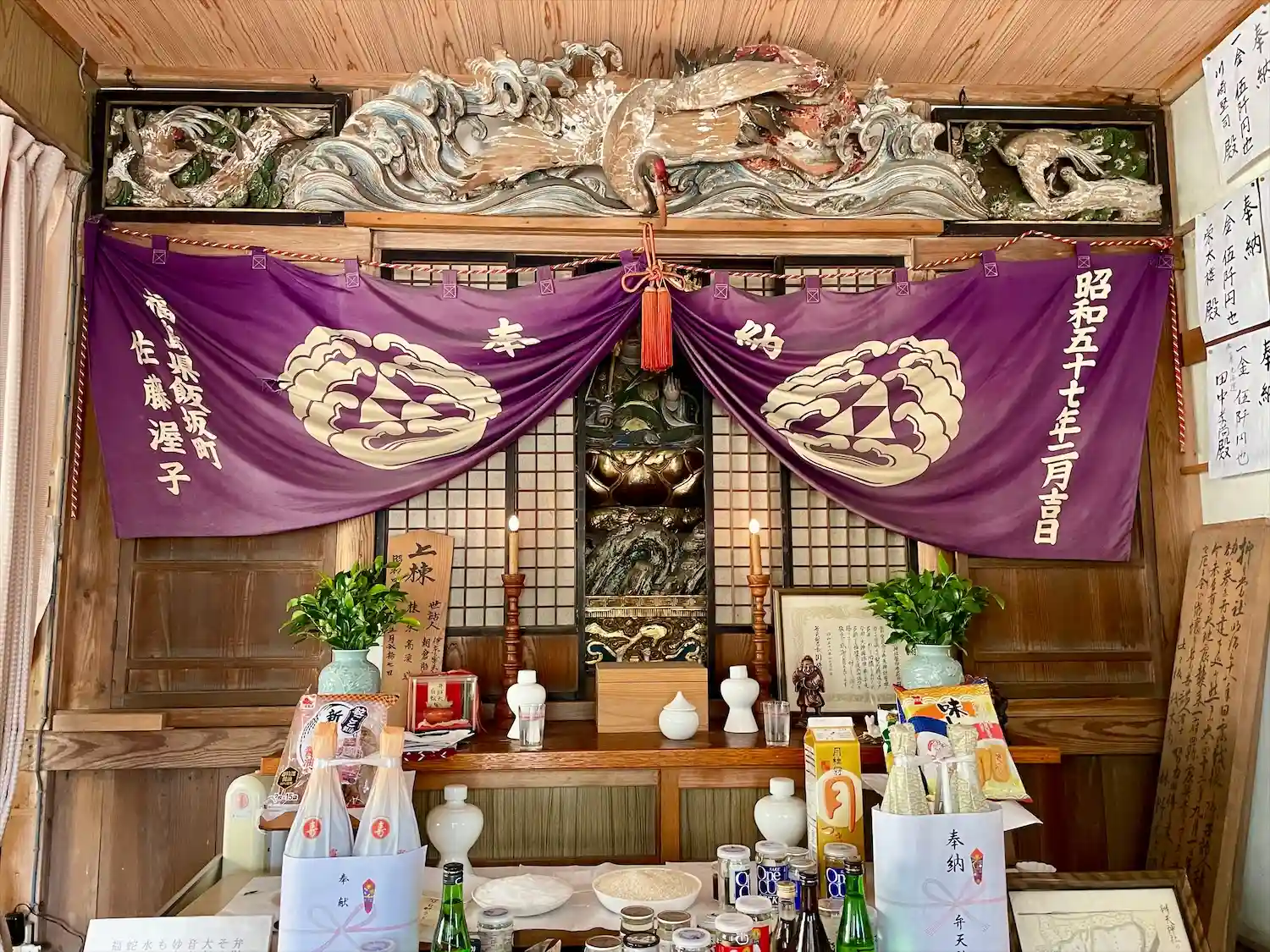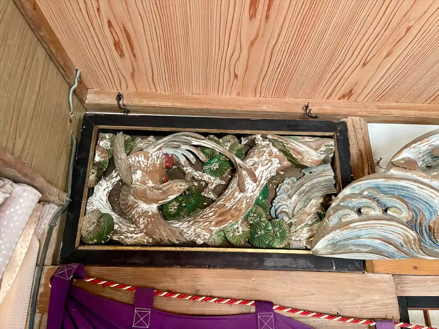 社殿内の欄間飾りのように掲げられている彫刻のうち、中央の「日の出に鶴」と左右の「松に山鵲」は元々は社殿の唐破風の妻飾りと脇障子と考えられる。