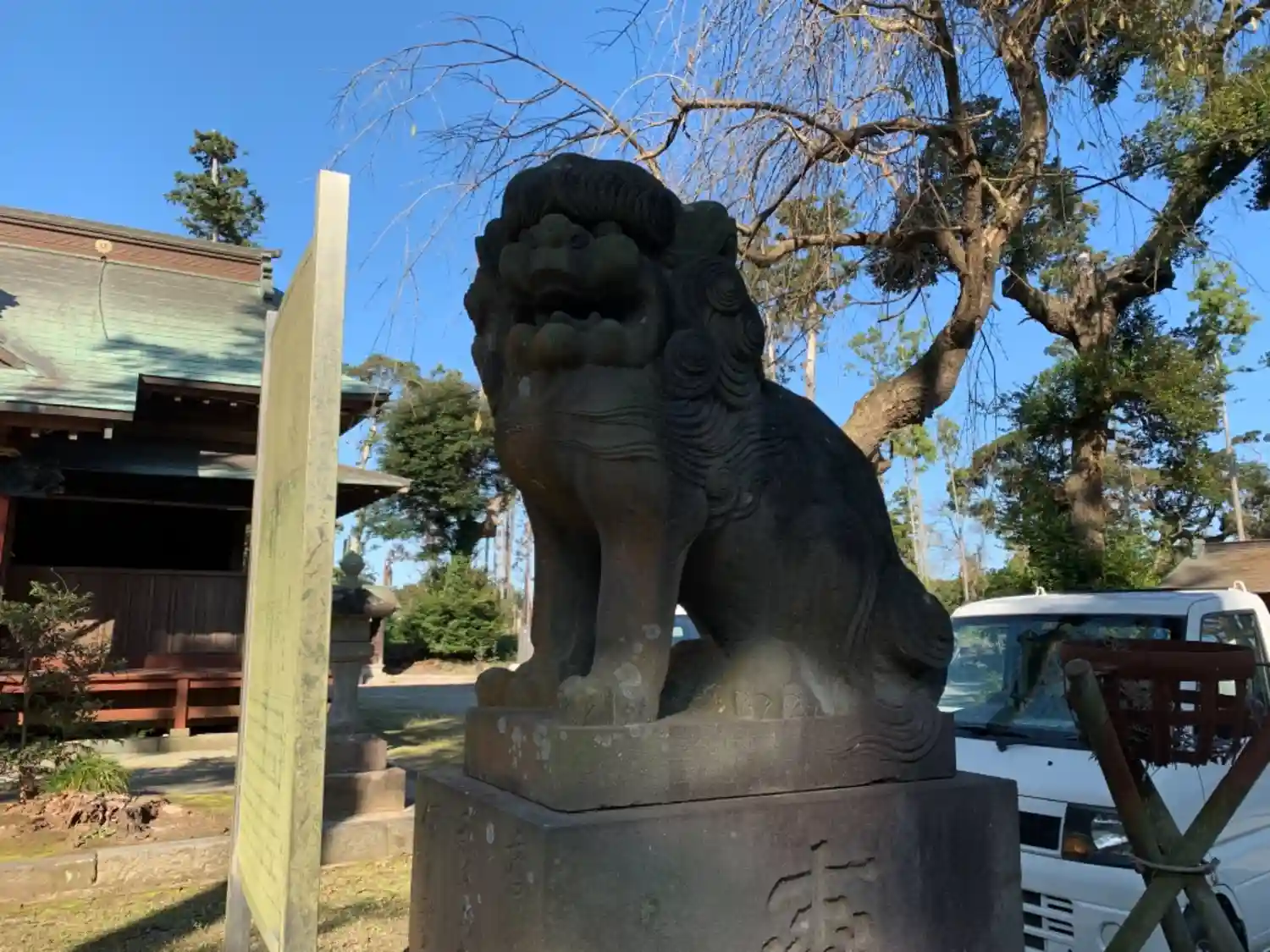 <拝殿>遠景。参道両側の<狛犬>は、大きくどっしりしたタイプ。