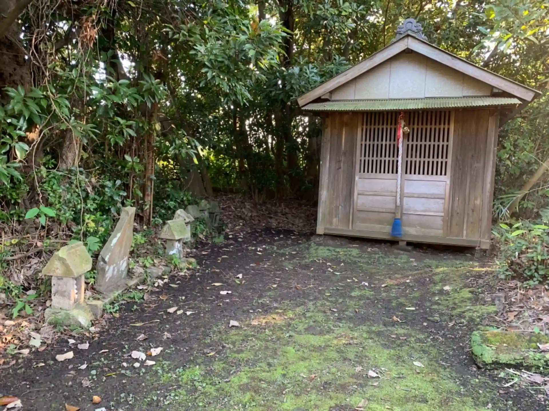 線路沿いの小さな神社。奥にもう一つ鳥居があります。狛犬の作者は佐生竹太郎。