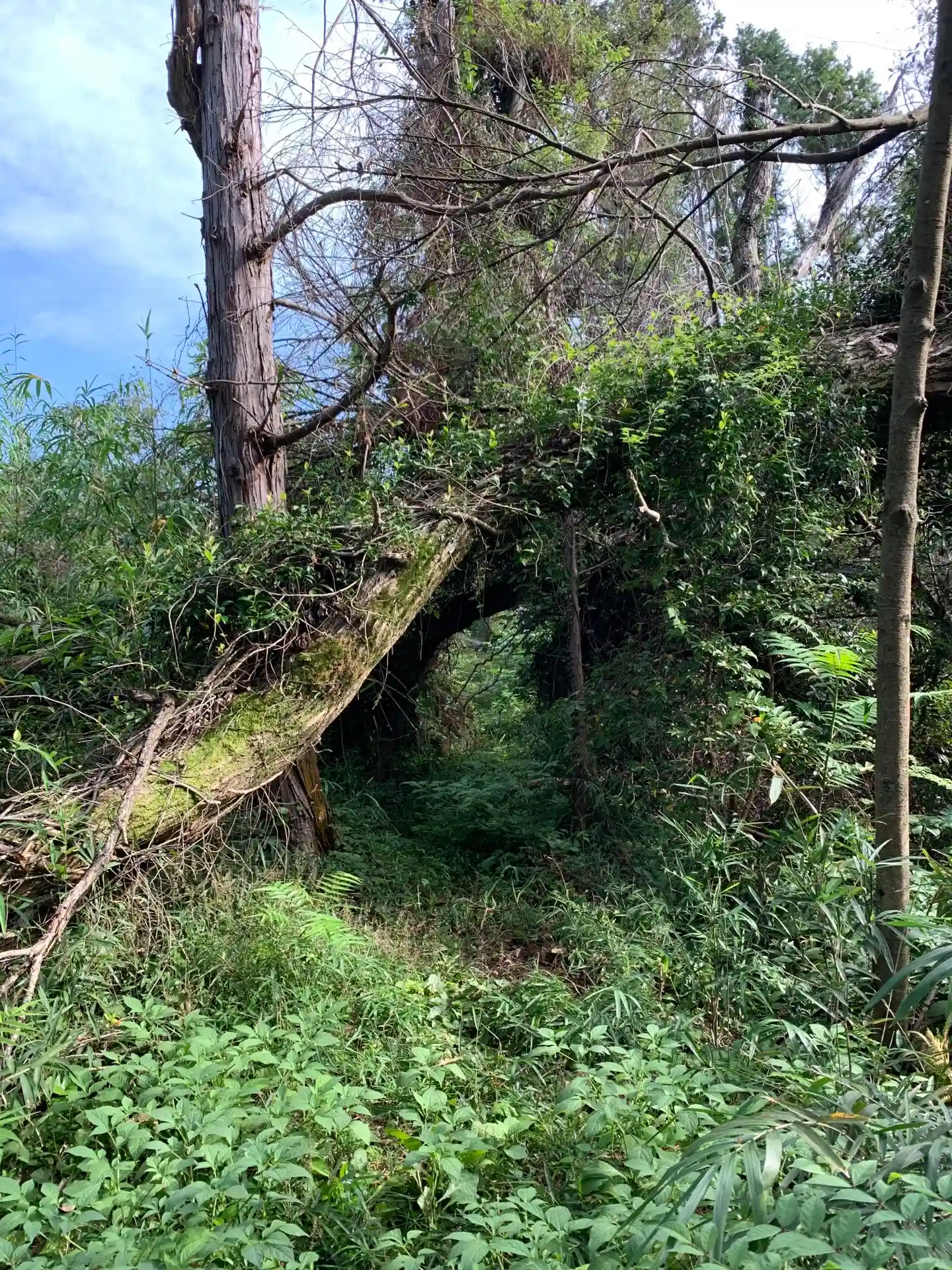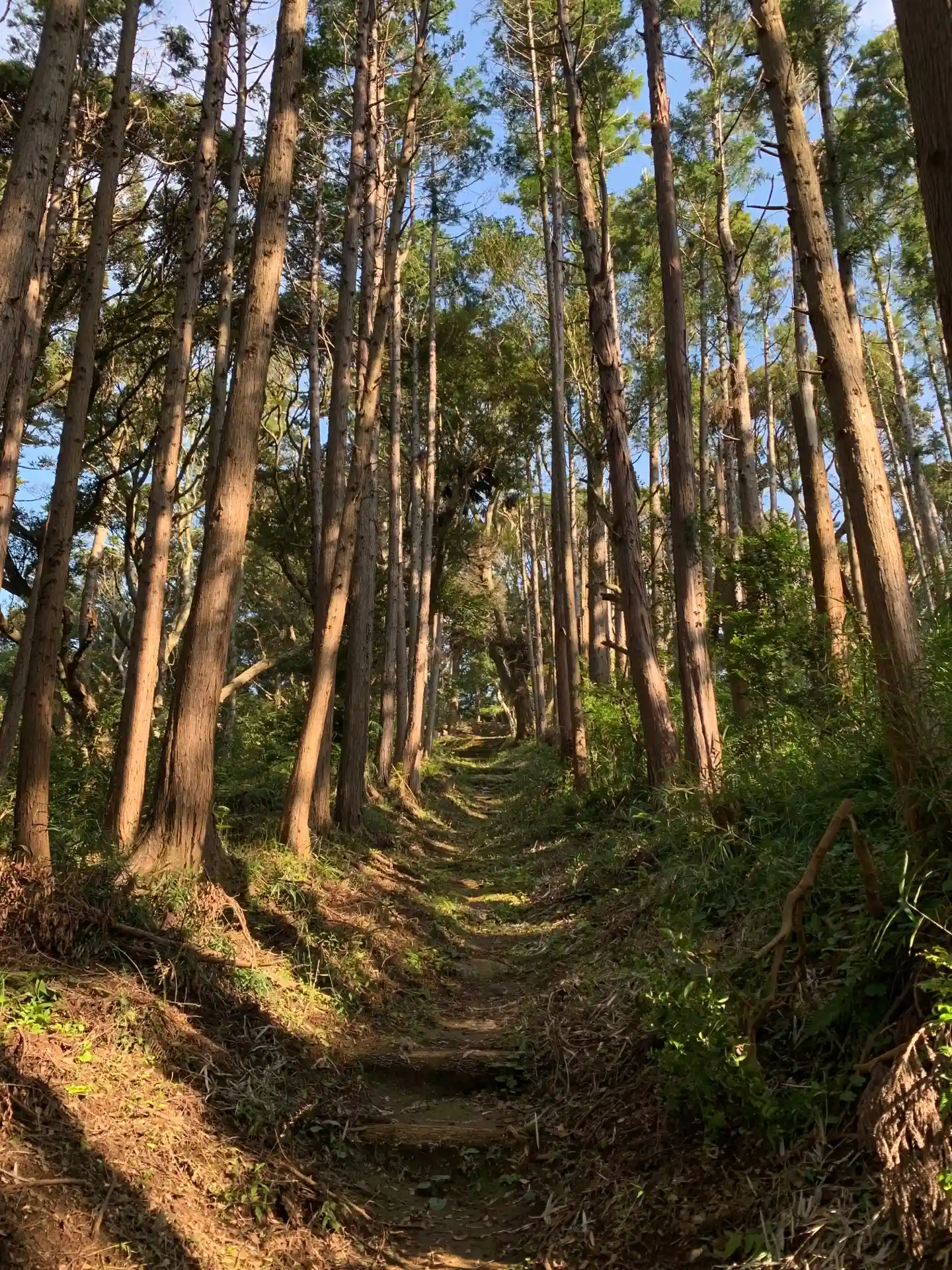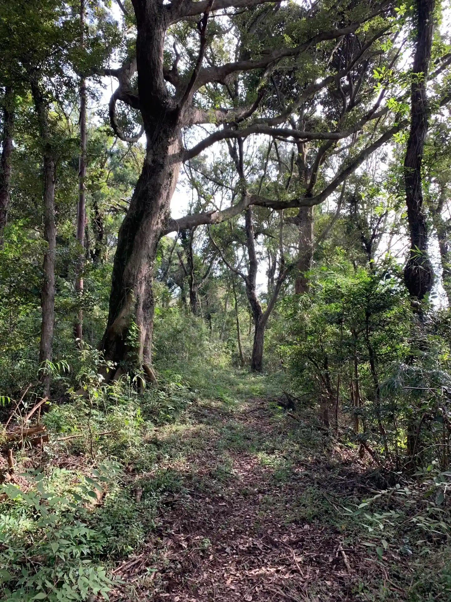 祠の奥から北側に、船塚神社につながる山道があります。尾根沿いに進むだけなので迷うことはありませんが、念のため地図を見ながら尾根から外れていないか確認しながら進んだ方がいいと思います。木に巻かれた色テープも確認しましょう。