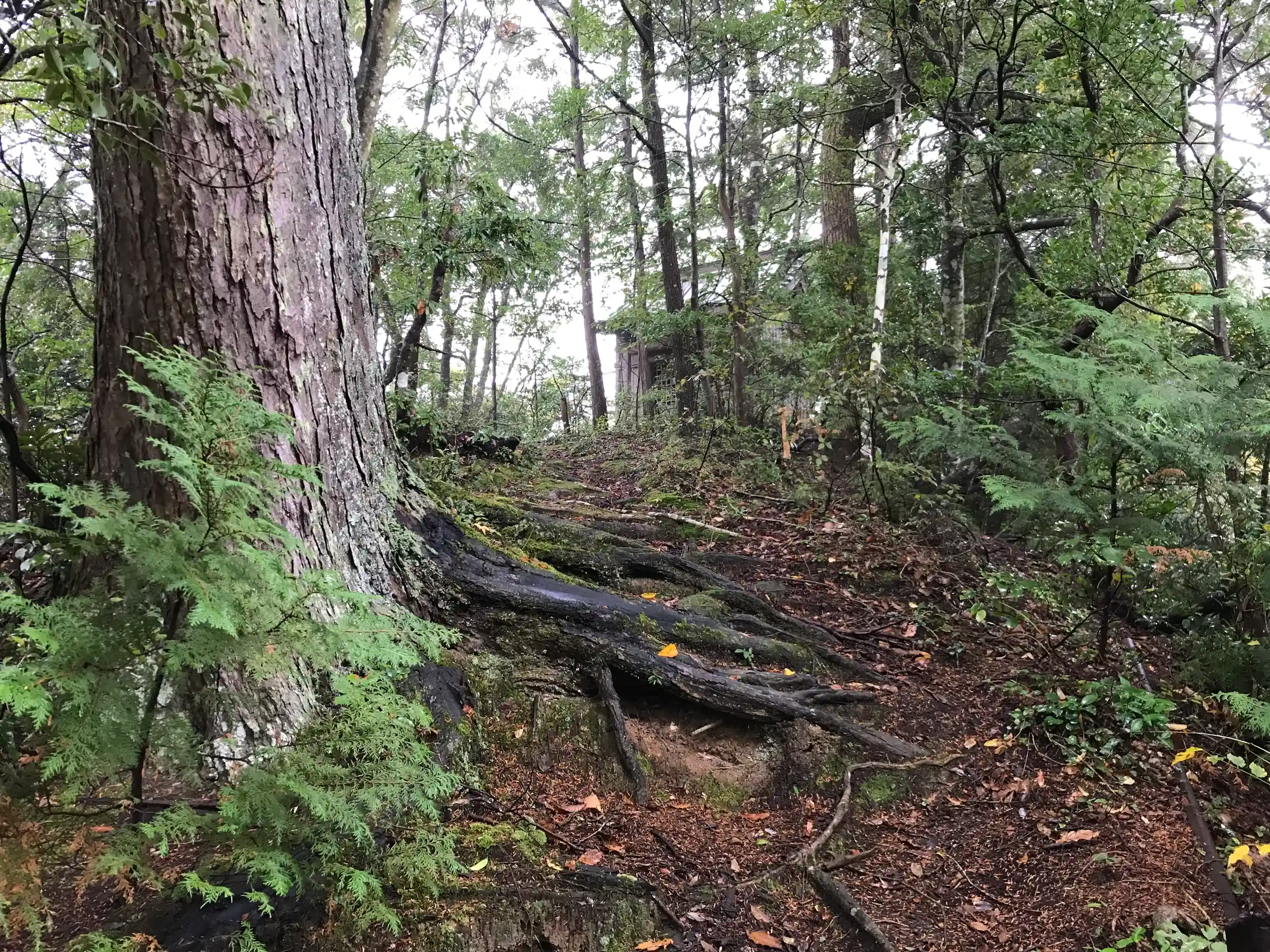根が張り苔むした山道を登ると...