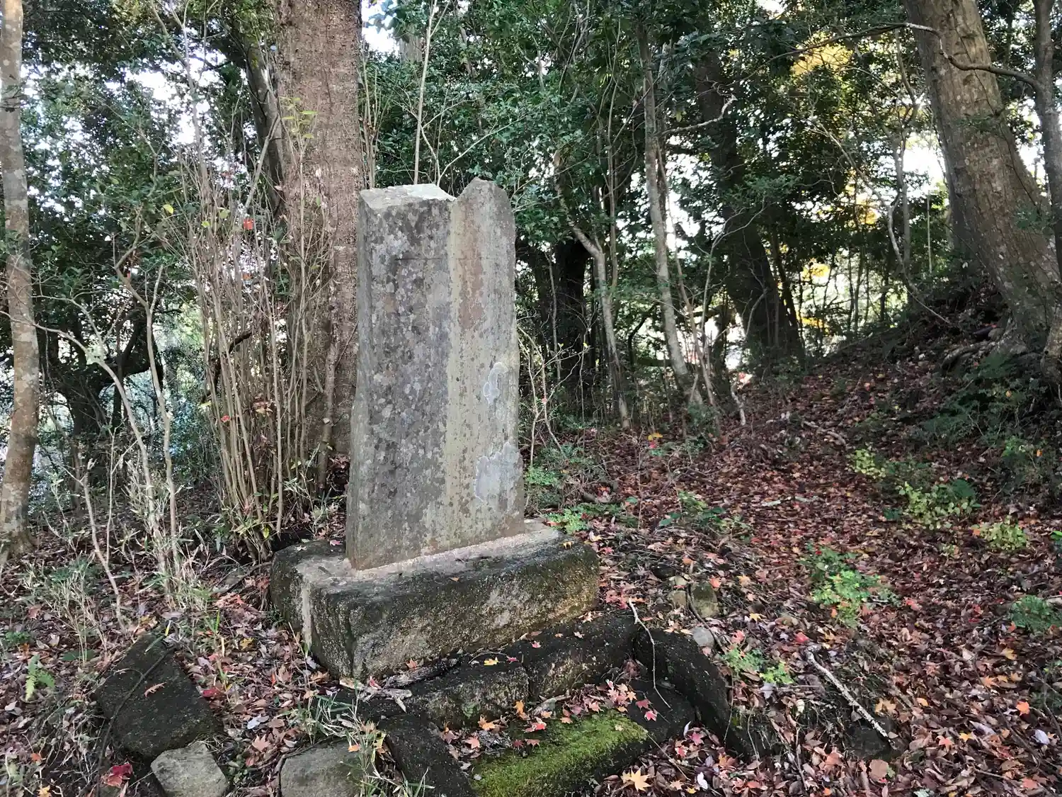 歪んだ石段の上には石碑があります。