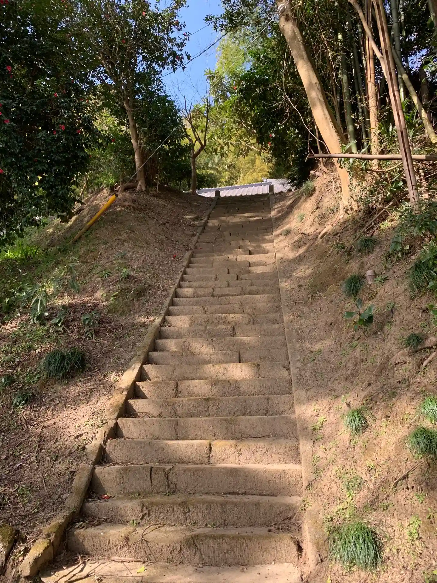奥の石段は本堂へ、手前の石段は観音堂に続いています。