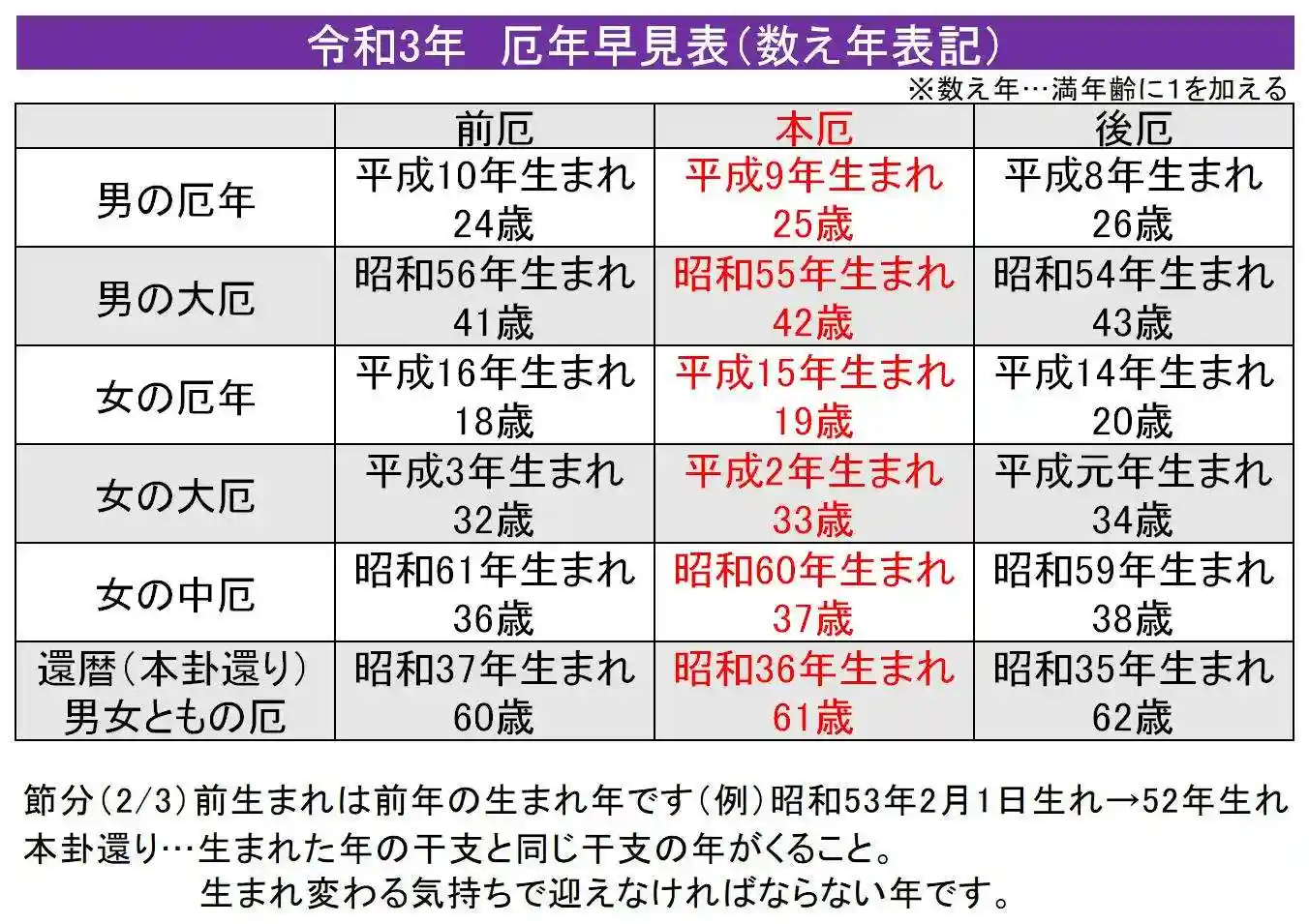 令和3年の厄年一覧表です。