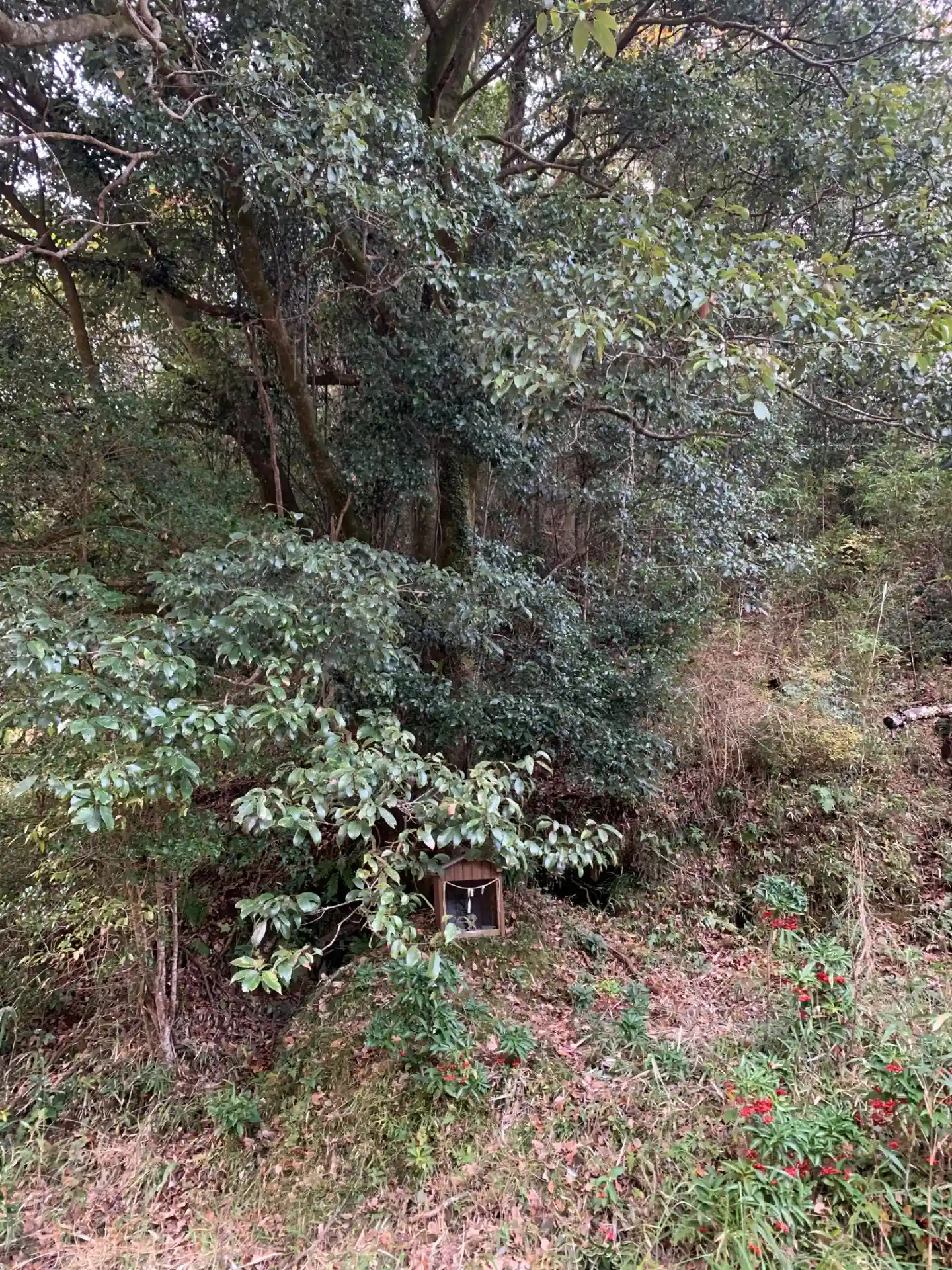 東側にある民家の私有地を突っ切って登ると空き地に出ますが、その片隅に小さな木祠があります。ゼンリンでは建造物として掲載されていますが、崩壊したのかその面影はありません。