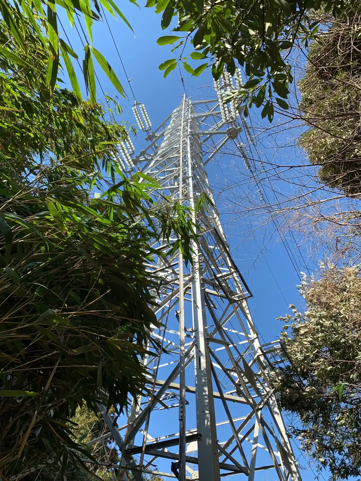 裏山へ続く山道があり、鉄塔の真下に行くことができました。