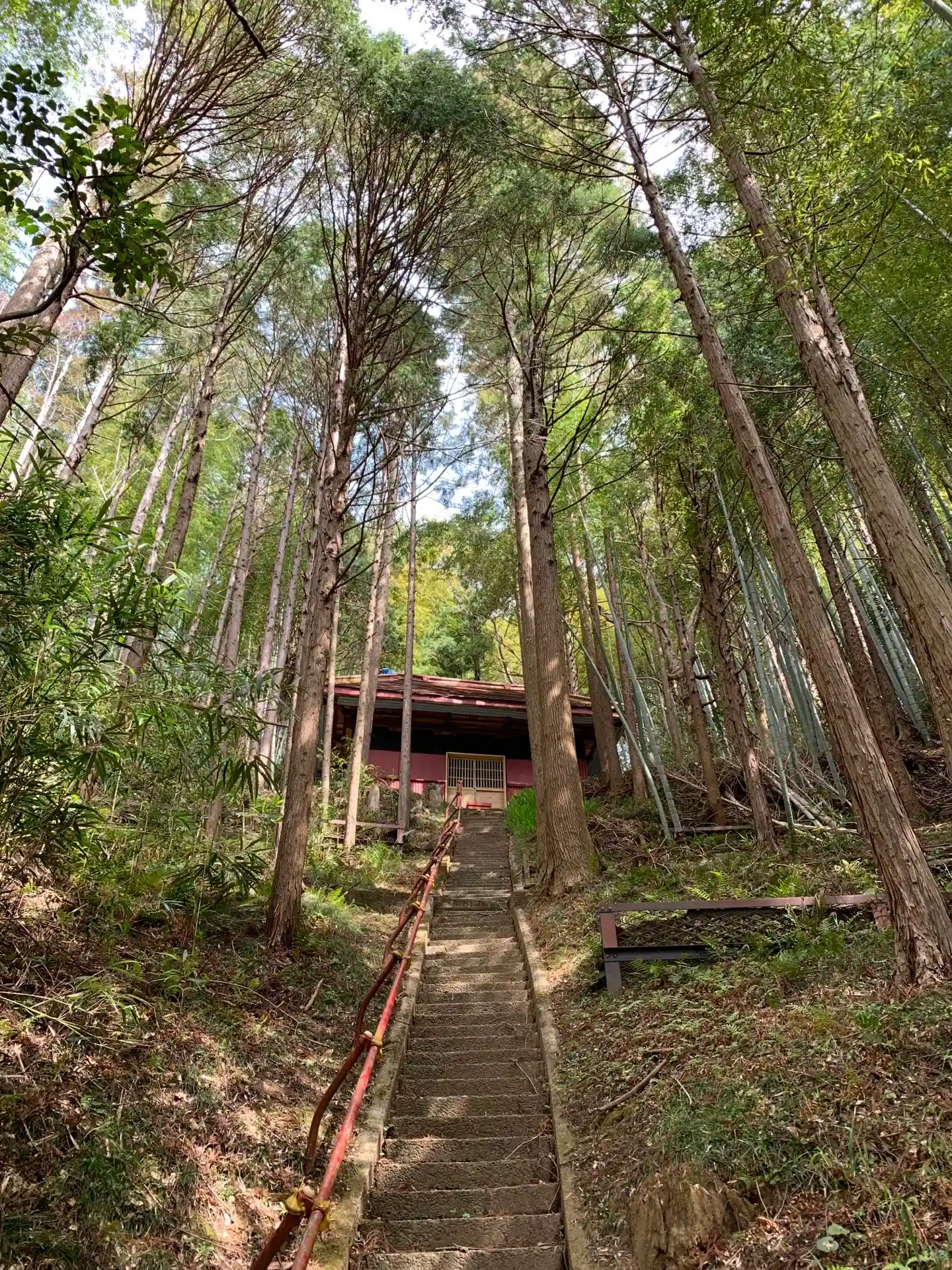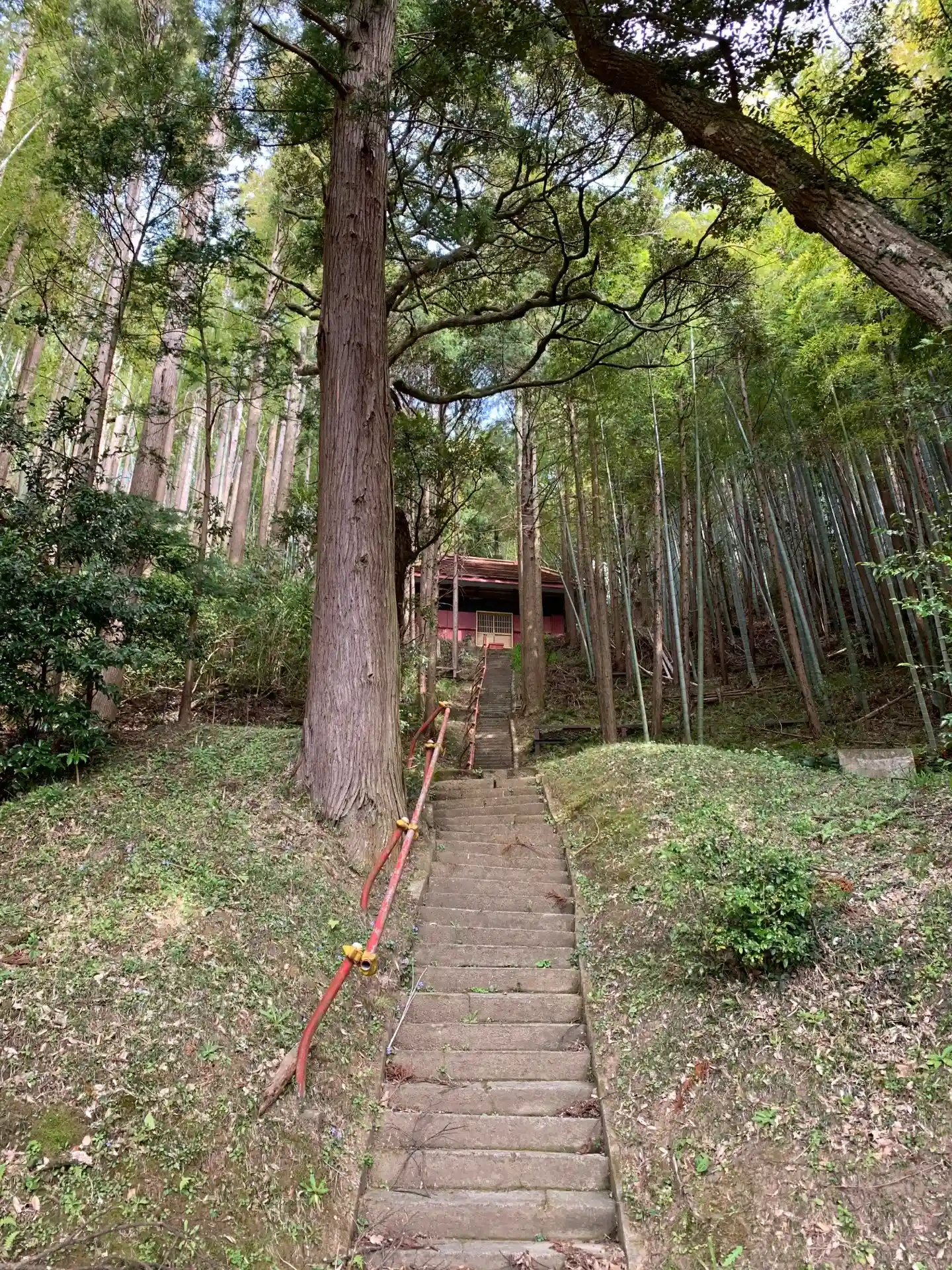 狭くて急な趣ある石段を登ると笑顔の狛犬…