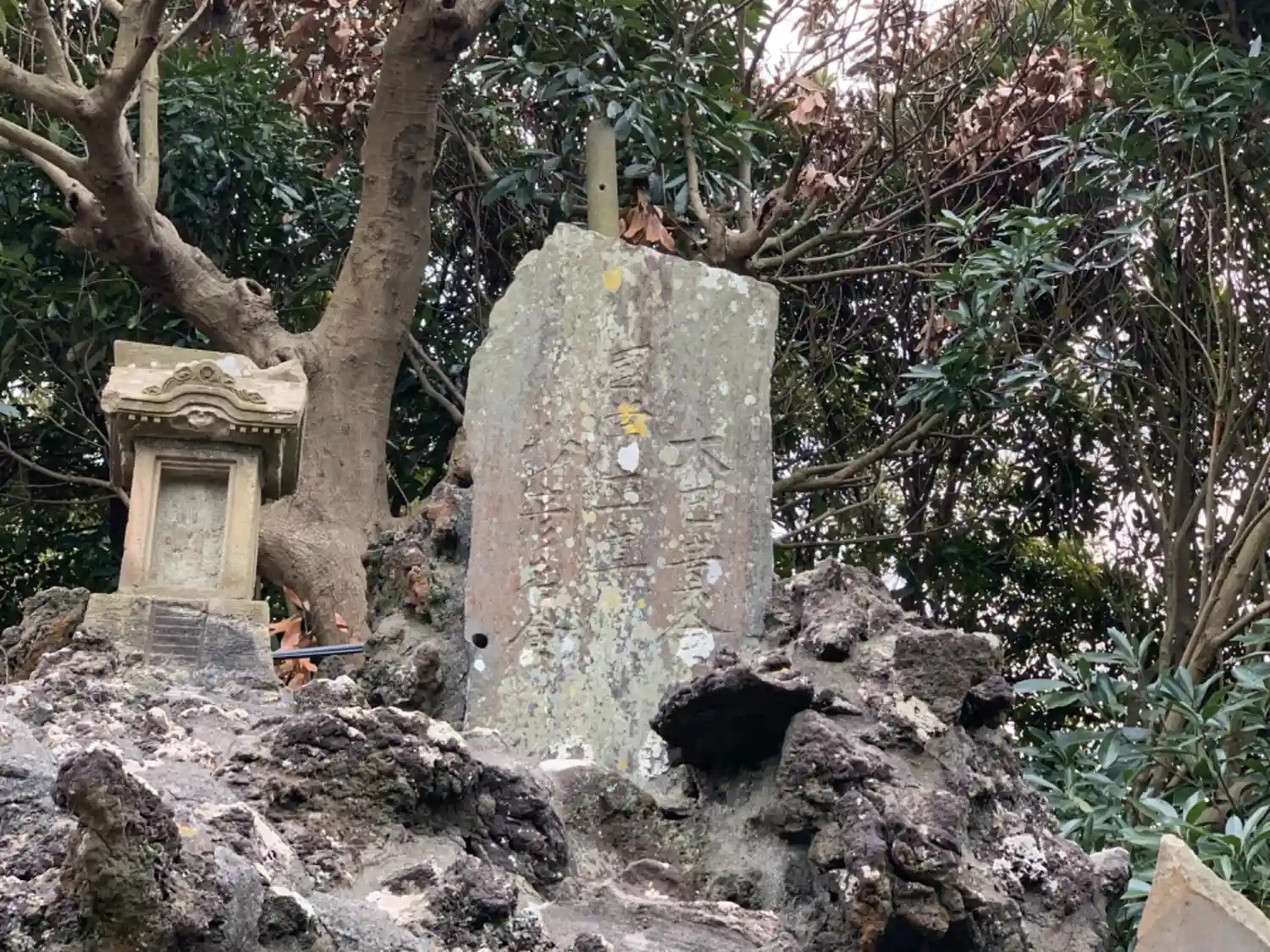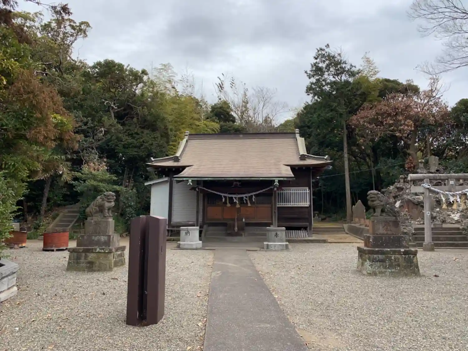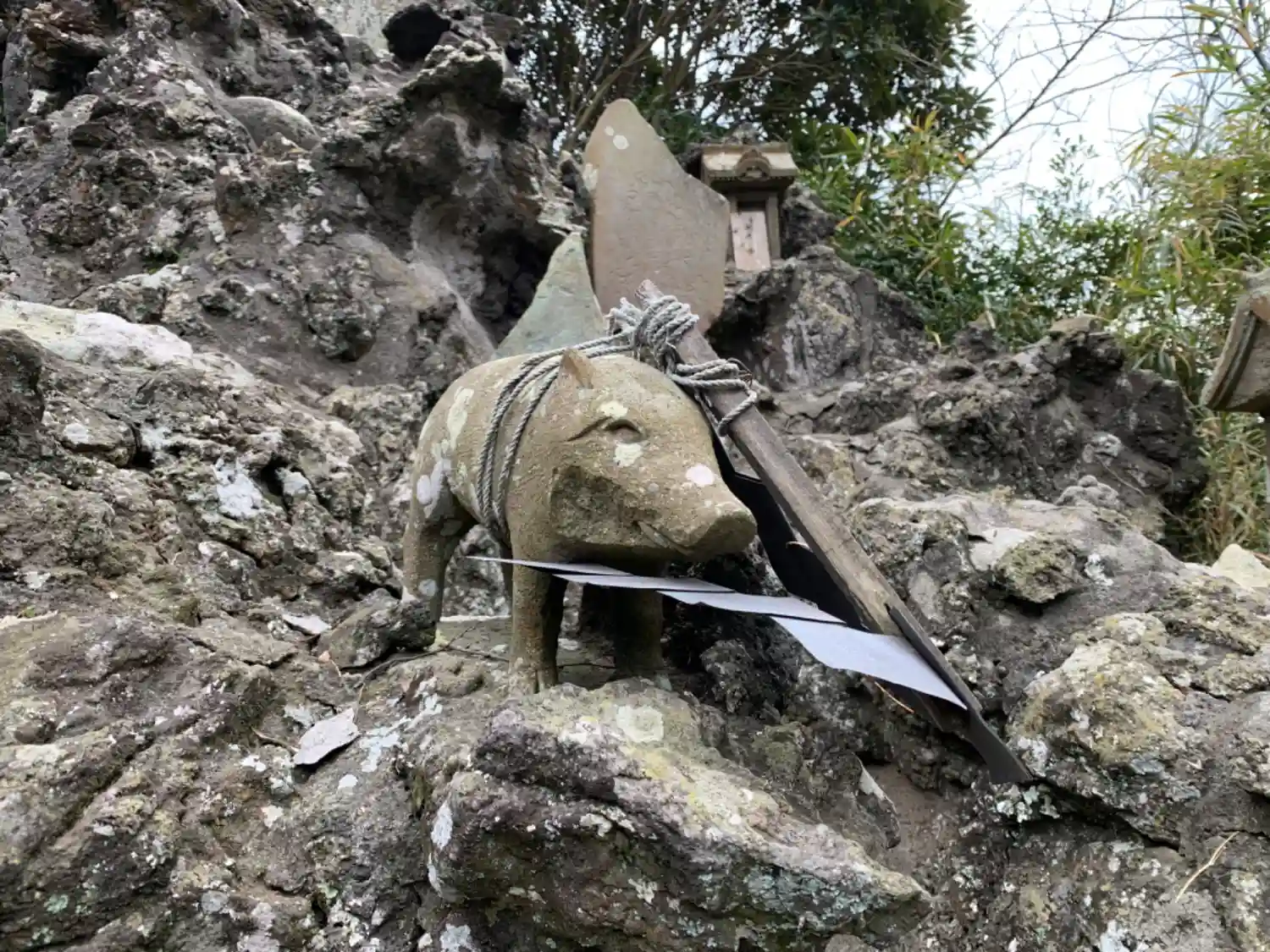 お寺の隣にある神社。狛犬と猪?付きのかなり立派な御嶽塚がありました。