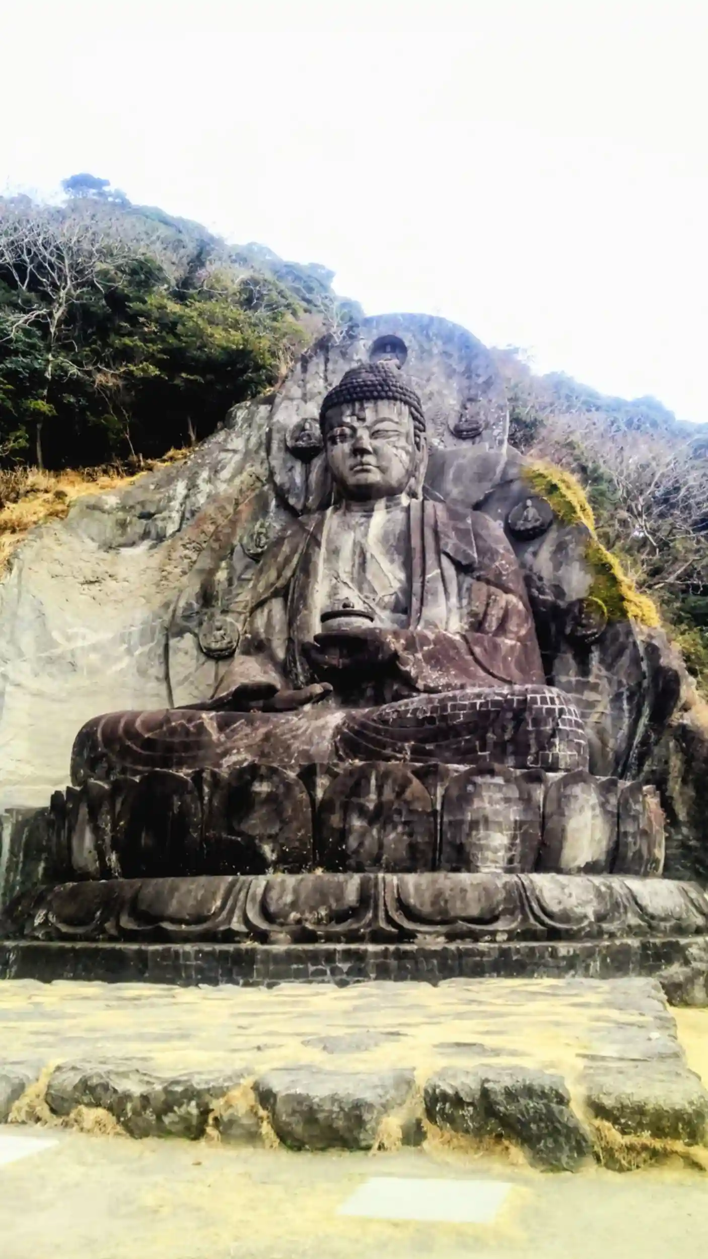 世界戦争戦死病没殉難者供養と交通犠牲者供養のために発願され、昭和35年から6年の歳月をかけて昭和41年にかつての石切場跡に彫刻完成されました。