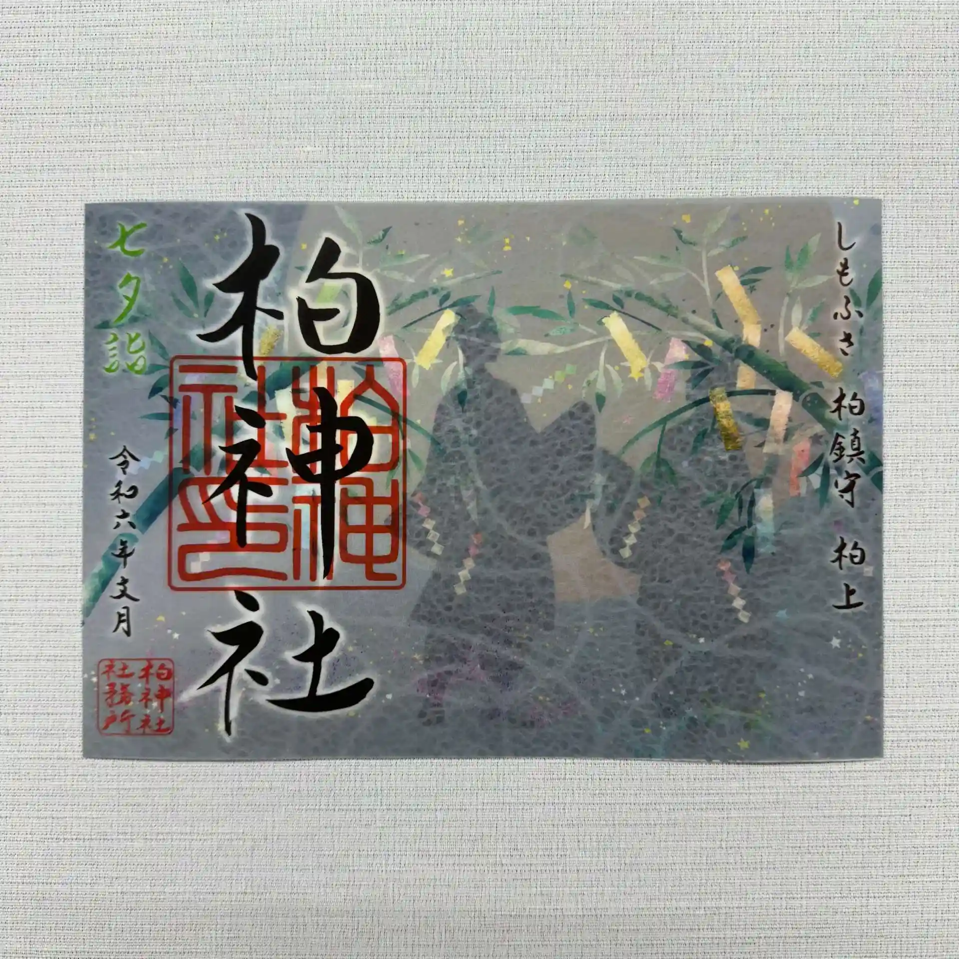 七夕の夜をモチーフに、透かし紙と白いレース和紙を重ねた文月限定の重ね御朱印です。