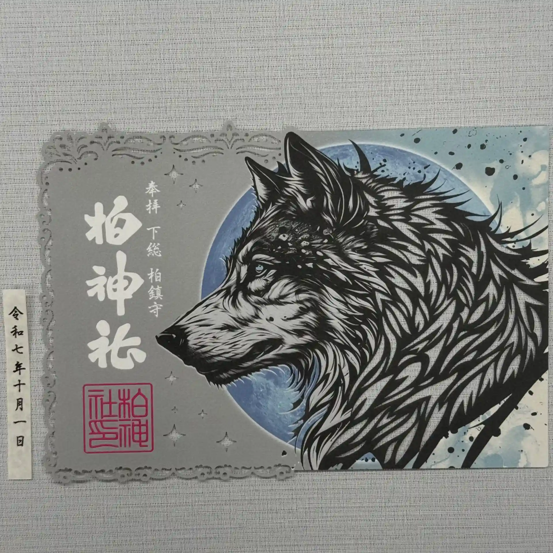 神の使いとされる狼と月をモチーフにした切り絵御朱印です。