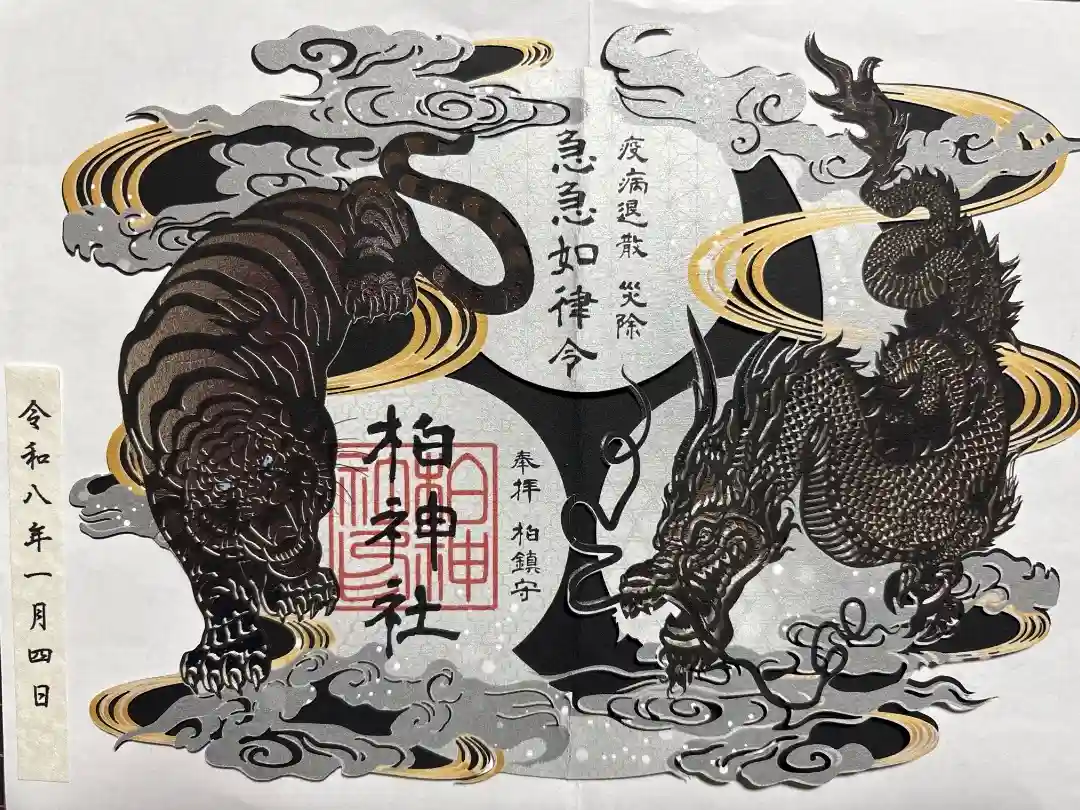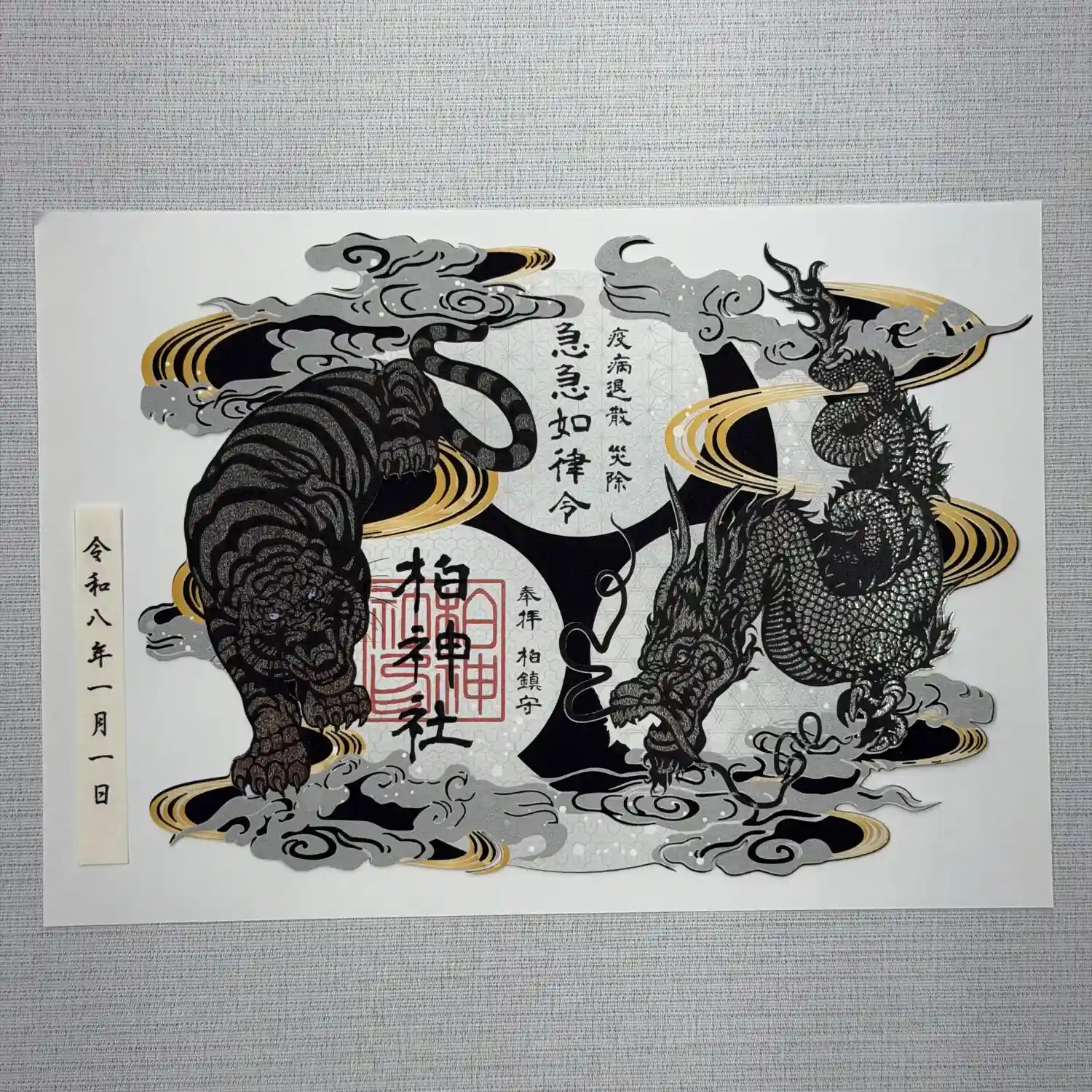 力強い龍と虎をデザインした、限定の切り絵御朱印です。