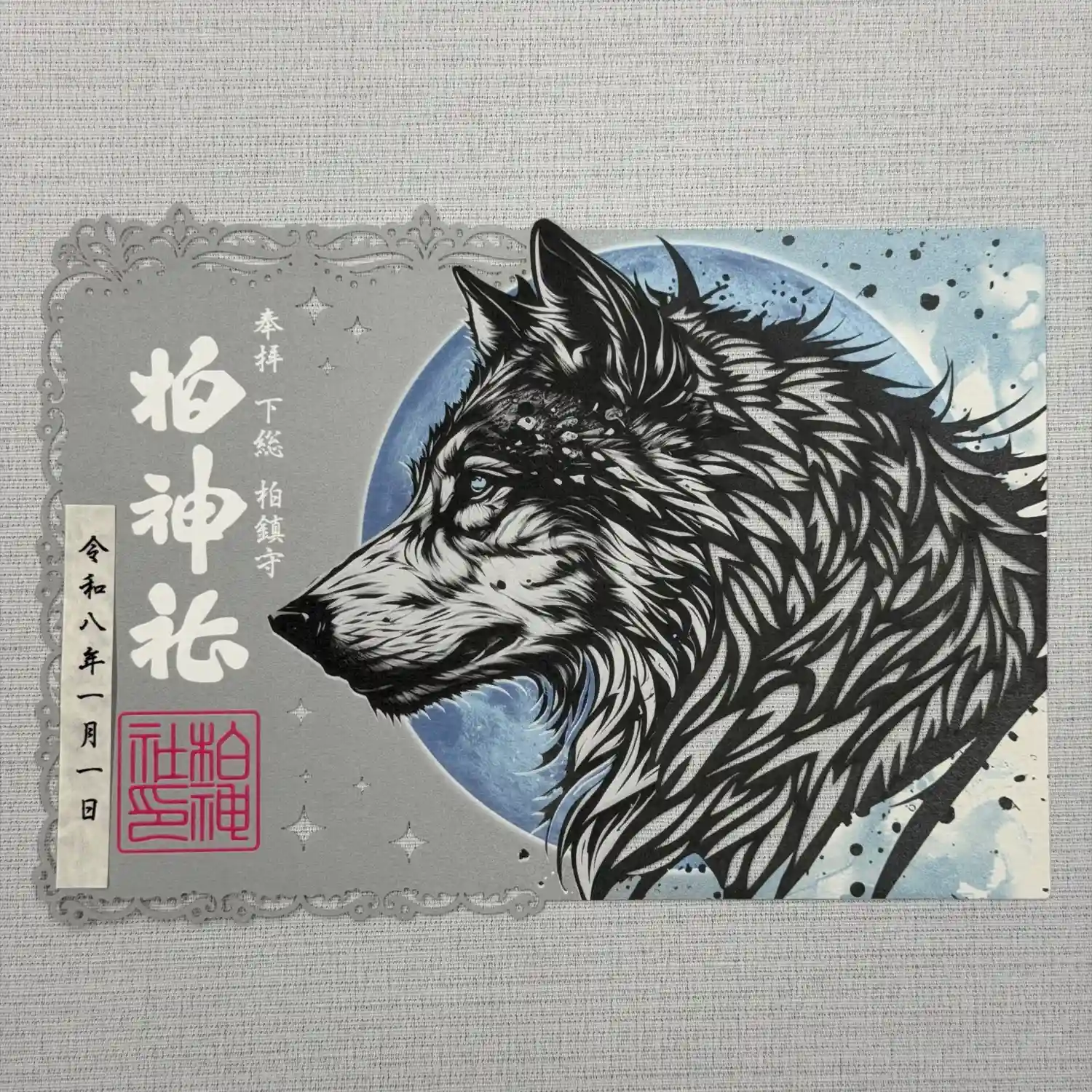 神の使いとされる狼と月をモチーフにした切り絵御朱印です。