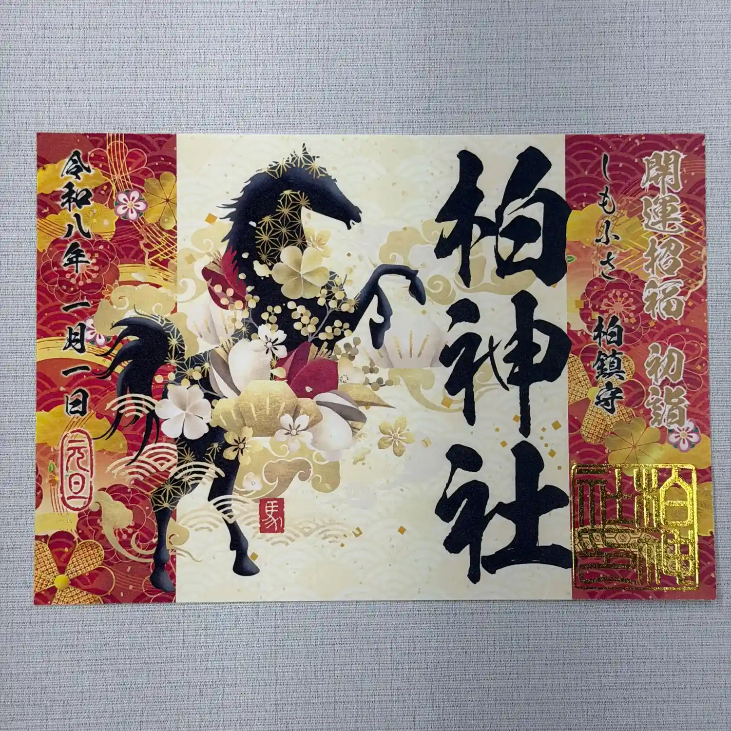 華やかな1月限定御朱印です。三ヶ日のみ日付が入ります。金の箔押し印を施しています。
