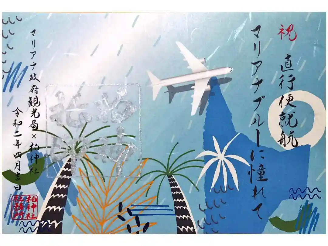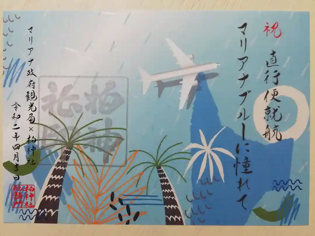 マリアナ政府観光局と柏神社コラボ。祝直行便就航 マリアナブルーに憧れて」椰子の木と熱帯植物の絵