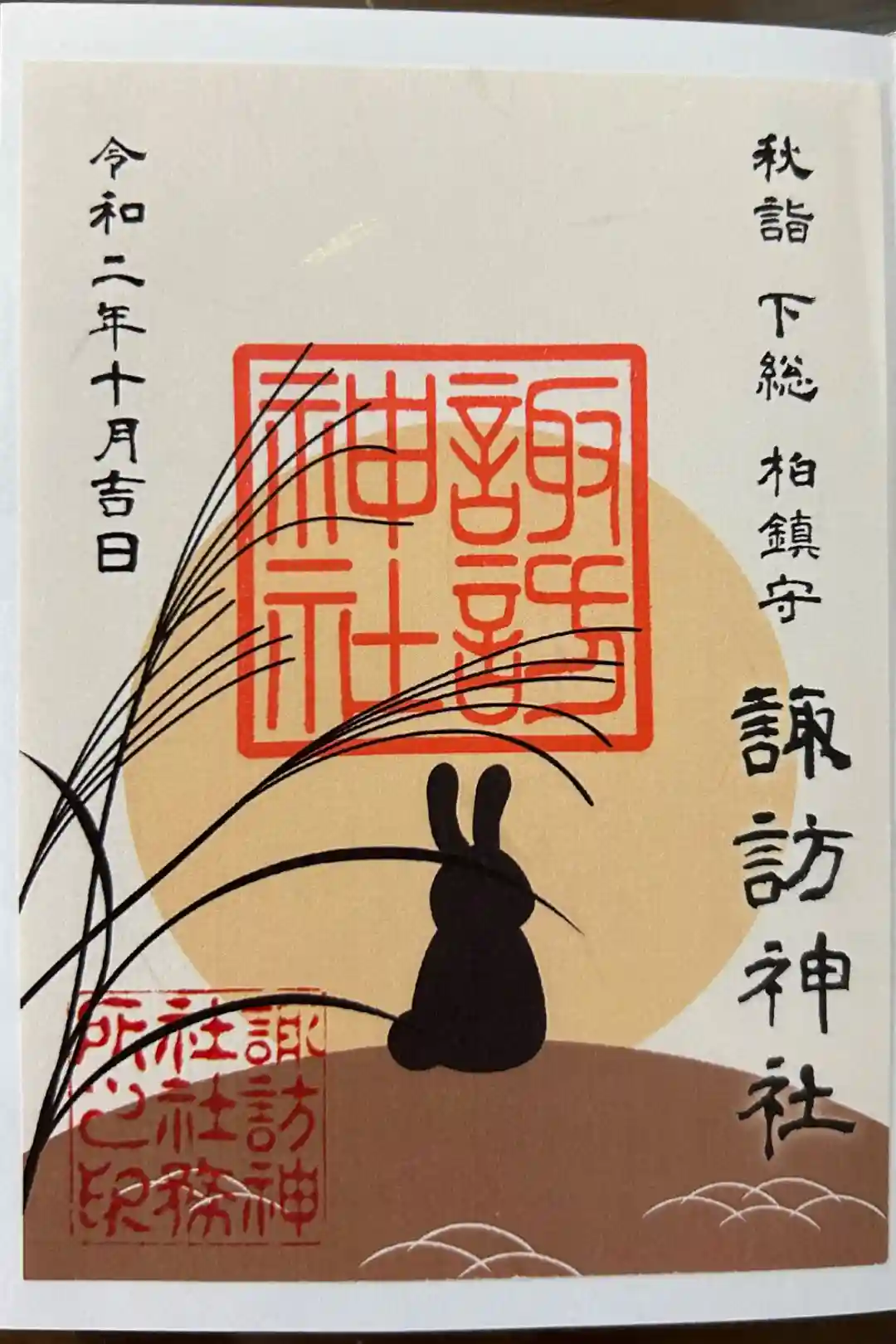 十五夜の月とうさぎが描かれた、和紙とレース和紙、透かし紙の三枚重ねの御朱印です。