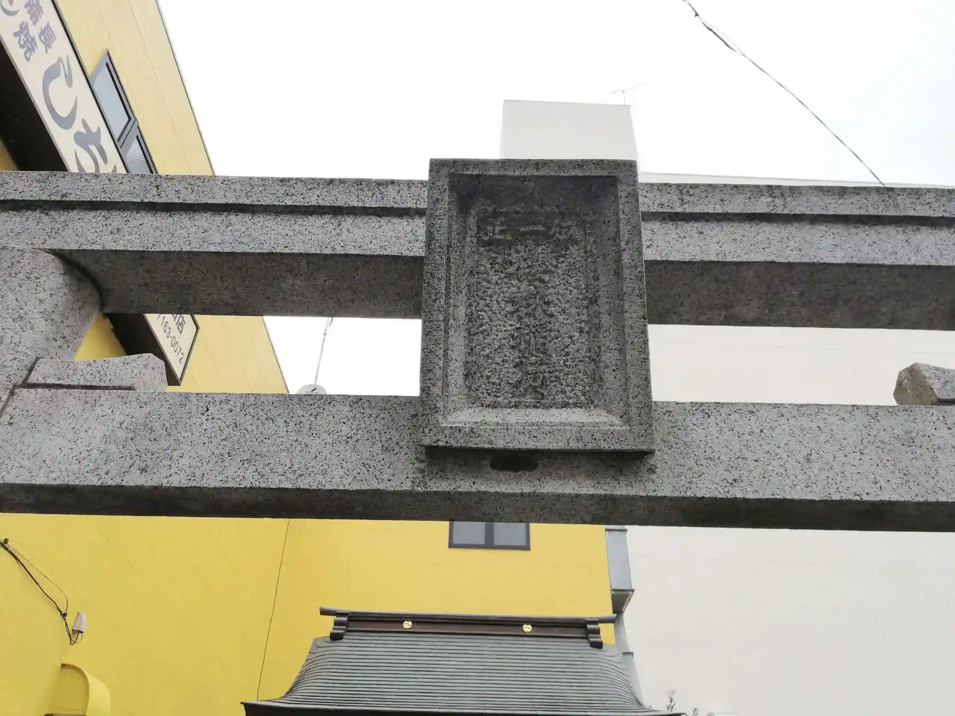 社号標。隣の黄色い建物は居酒屋さんが入居しています。
