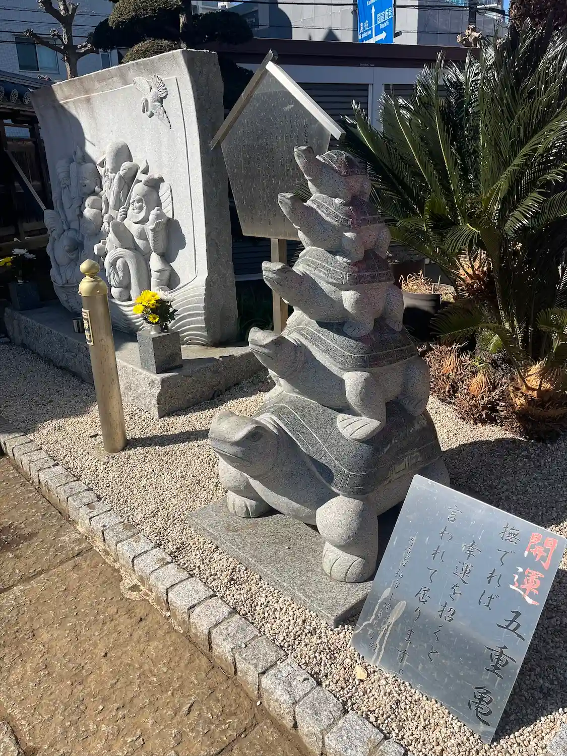 亀発見。長全寺会館入口の開運五重亀。なでると幸運を招きます。たくさんの人に撫でられた跡があります。