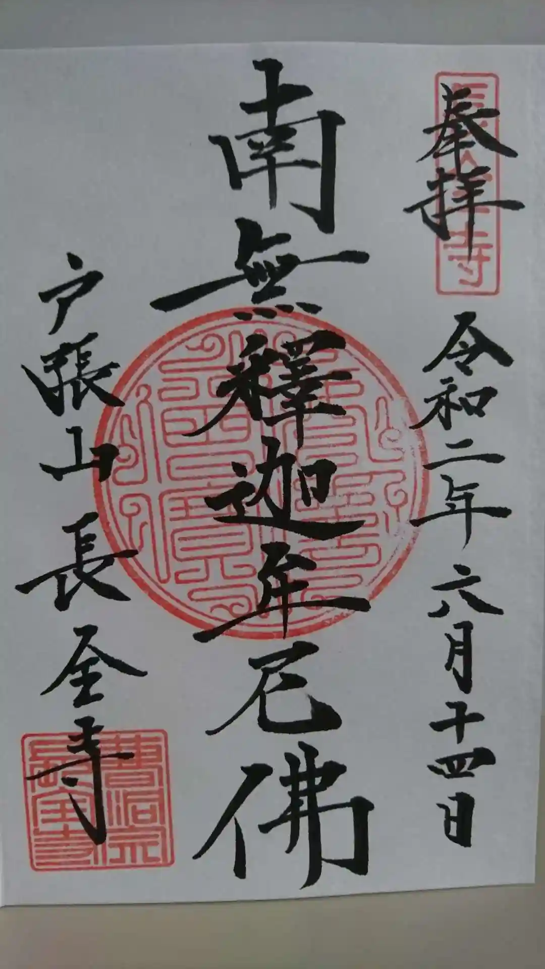 長全寺会館で頂きました。直書きです。