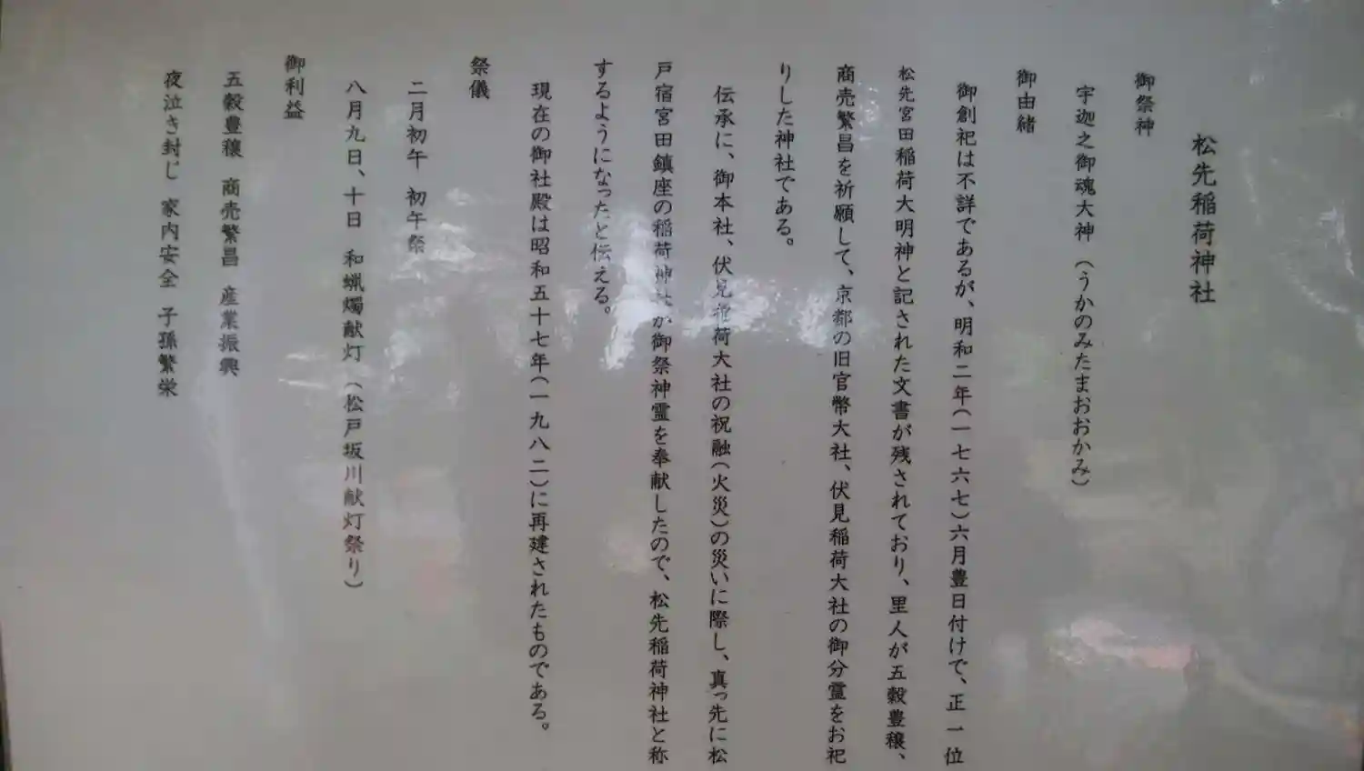 | ご由緒 | 御創祀は不詳であるが、明和二年(一七六七)六月豊日付けで、正一位松先宮田稲荷大明神と記された文書が残されており、里人が五穀豊穣、商売繁昌を祈願して、京都の旧官幣大社伏見稲荷大社の御分霊をお祀りした神社である。
