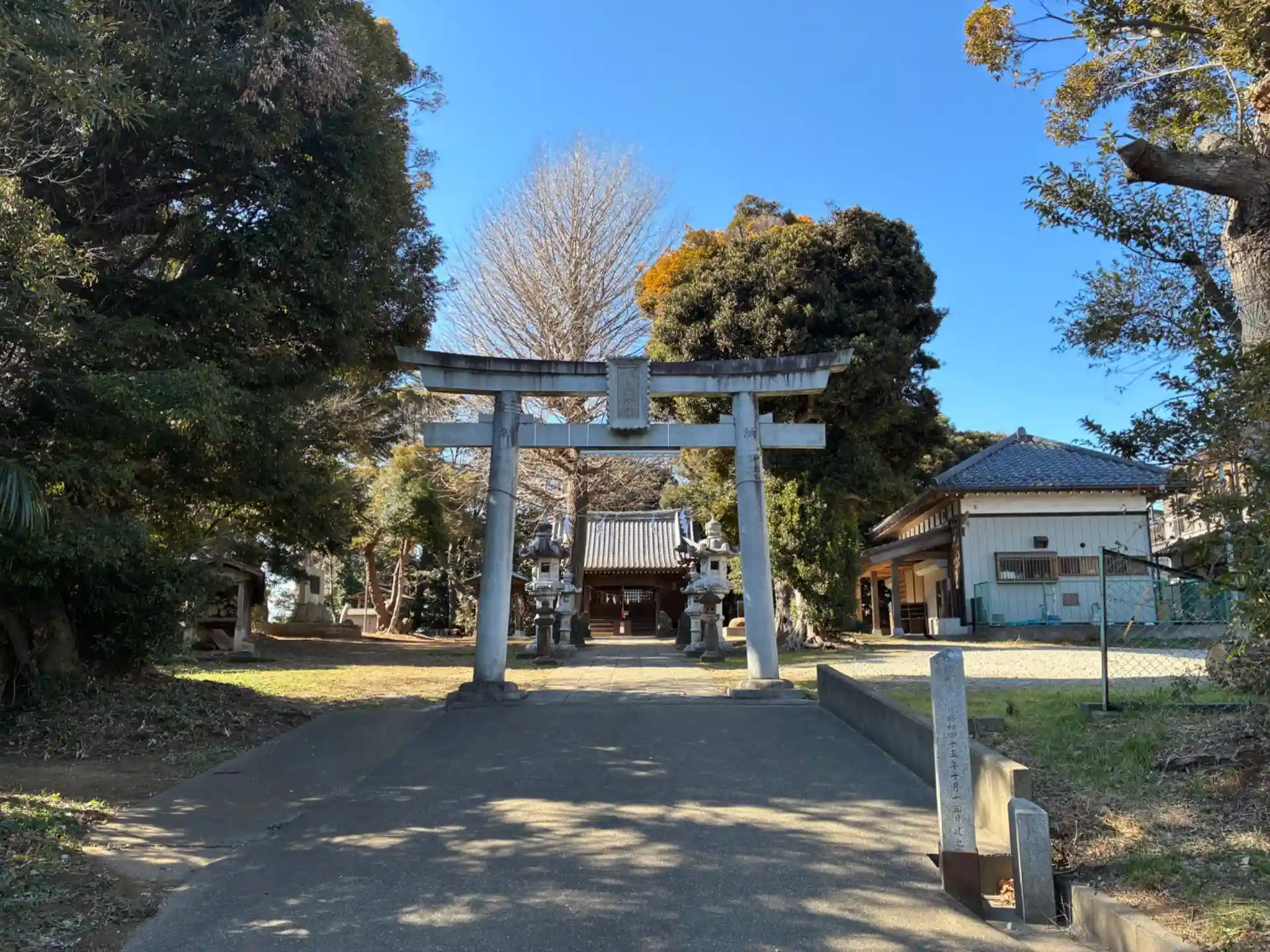 とても長い参道を有する神社。かつて周りに何もなかった頃はこの神社だけ小高い塚の上にあることが一目でわかったそうで、この塚は生月という伝説の名馬が眠る塚と伝えられているそう。
