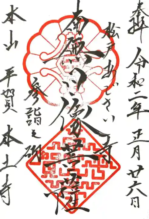 真ん中に南無日像菩薩と書かれ、右に松戸あじさい寺の文字、上部に寺紋の印、下部に平賀本土寺の三宝印、左に参詣之砌(さんけいのみぎり)の文字、「本山 平賀 本土寺」の文字が入っています。