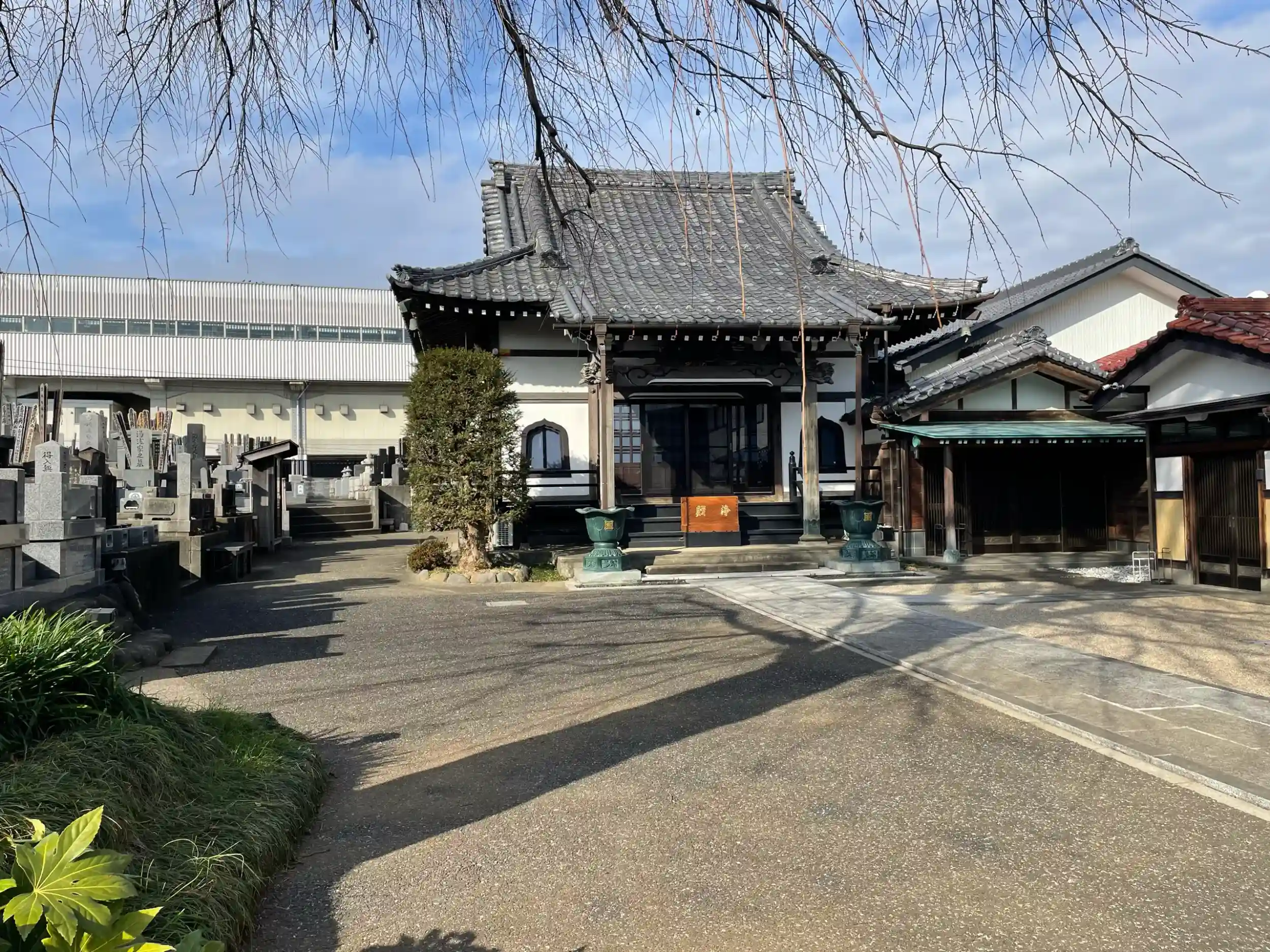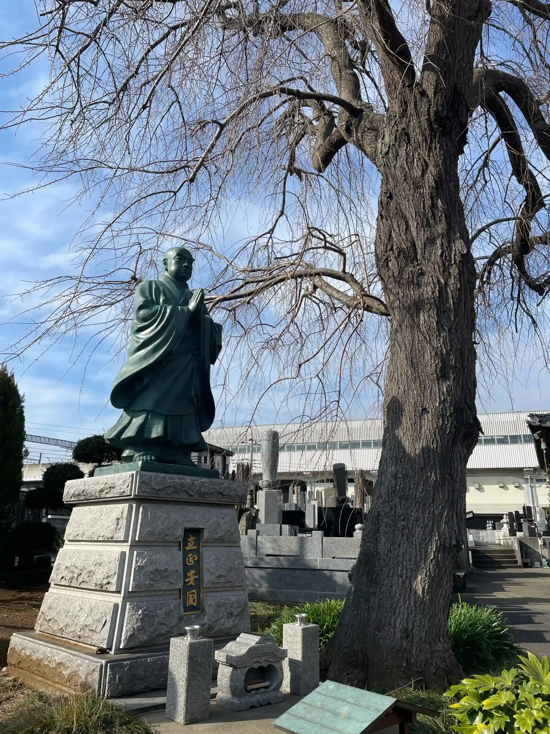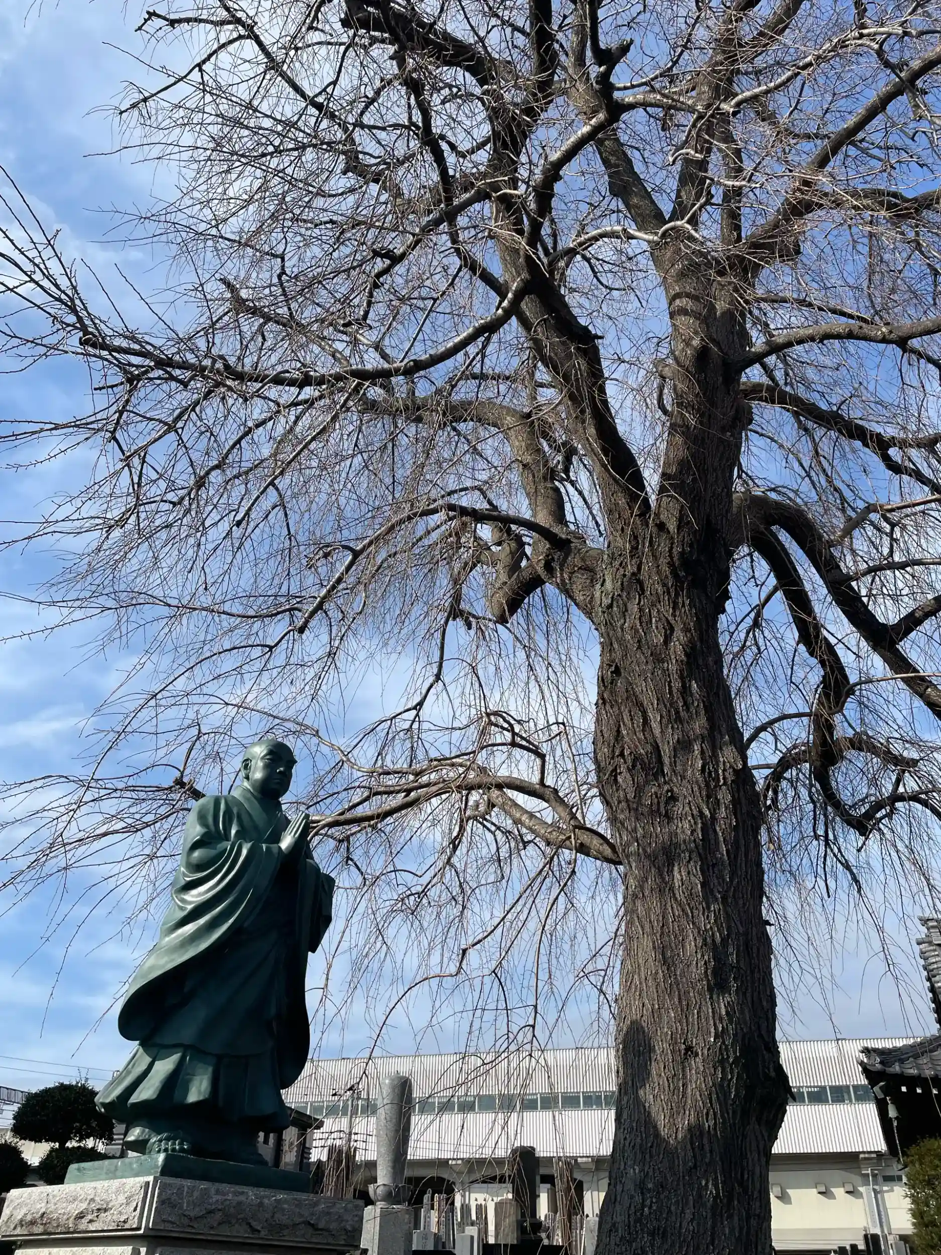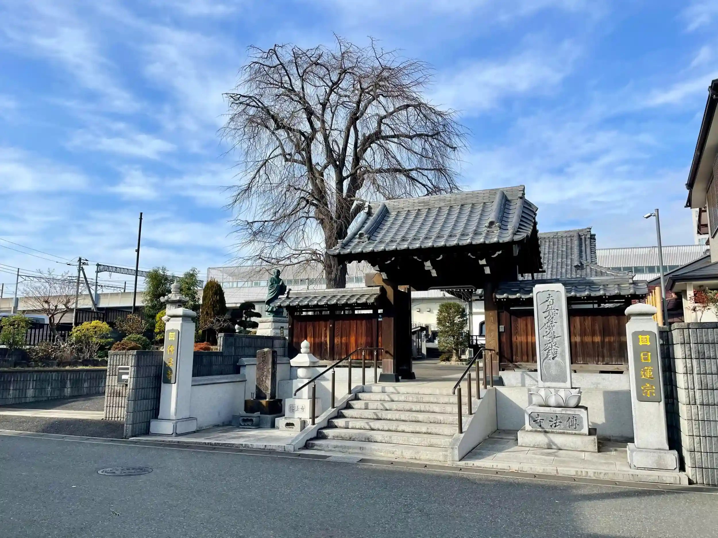 また、境内には日蓮上人像と並んで大きな枝垂桜がある。