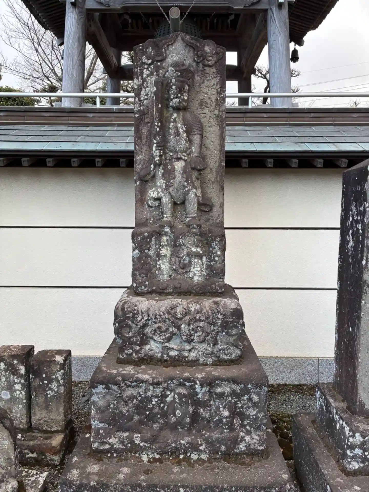 山門前には、村内(紙敷村)に悪霊が入ってこないようにと、1852年(嘉永5年)銘の庚申塔が建てられ、1988年(昭和63年)12月15日、松戸市の有形文化財に指定されました。