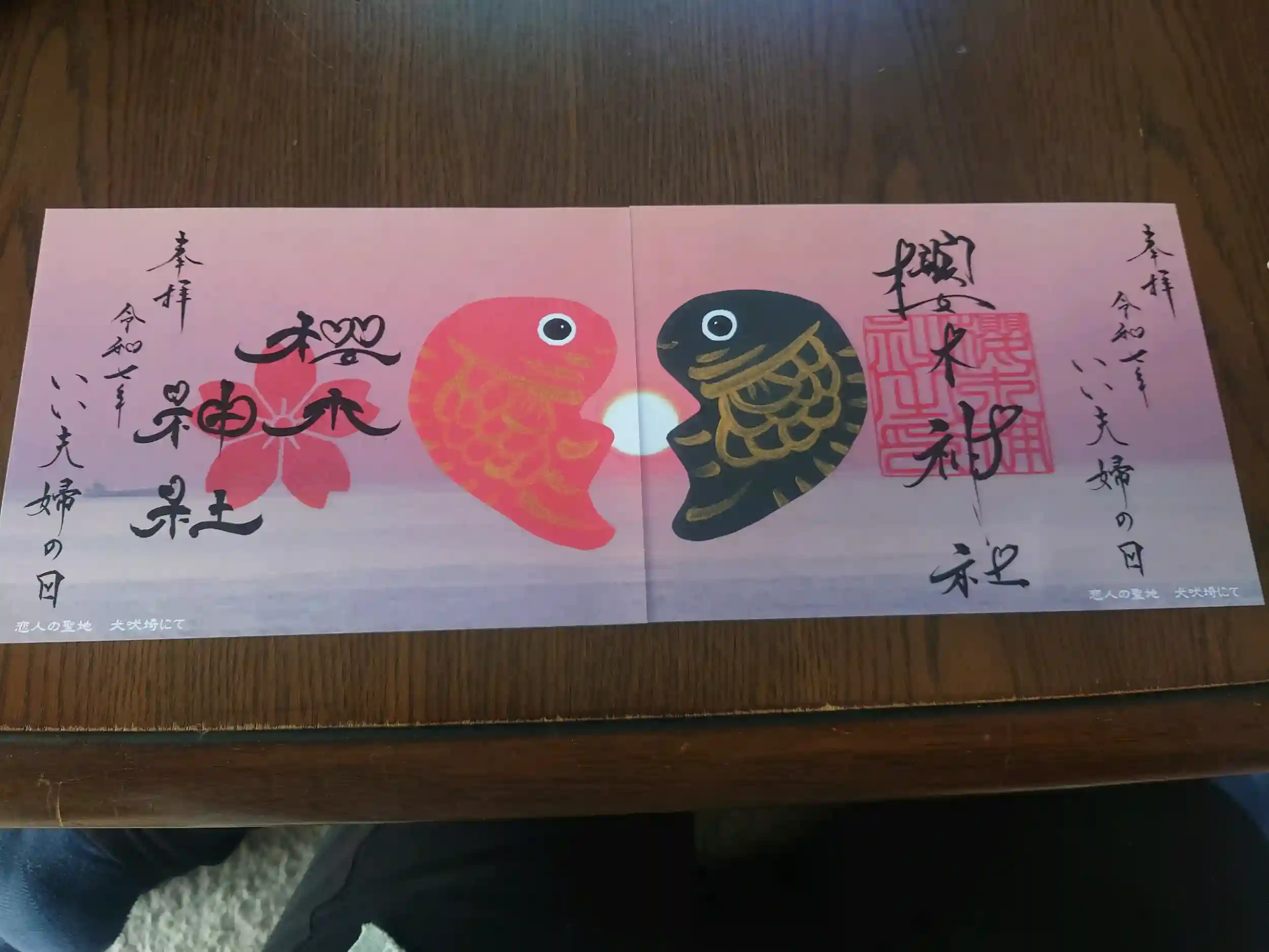 いい夫婦の日限定御朱印を頂きに夫と参拝してきました。犬吠埼をバックに鯛の絵柄が可愛い❤これからも