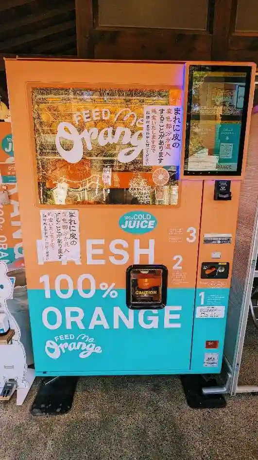 最近よく見るこの自販機。オレンジジュースの自販機です🍊社務所の横に設置されていました😆