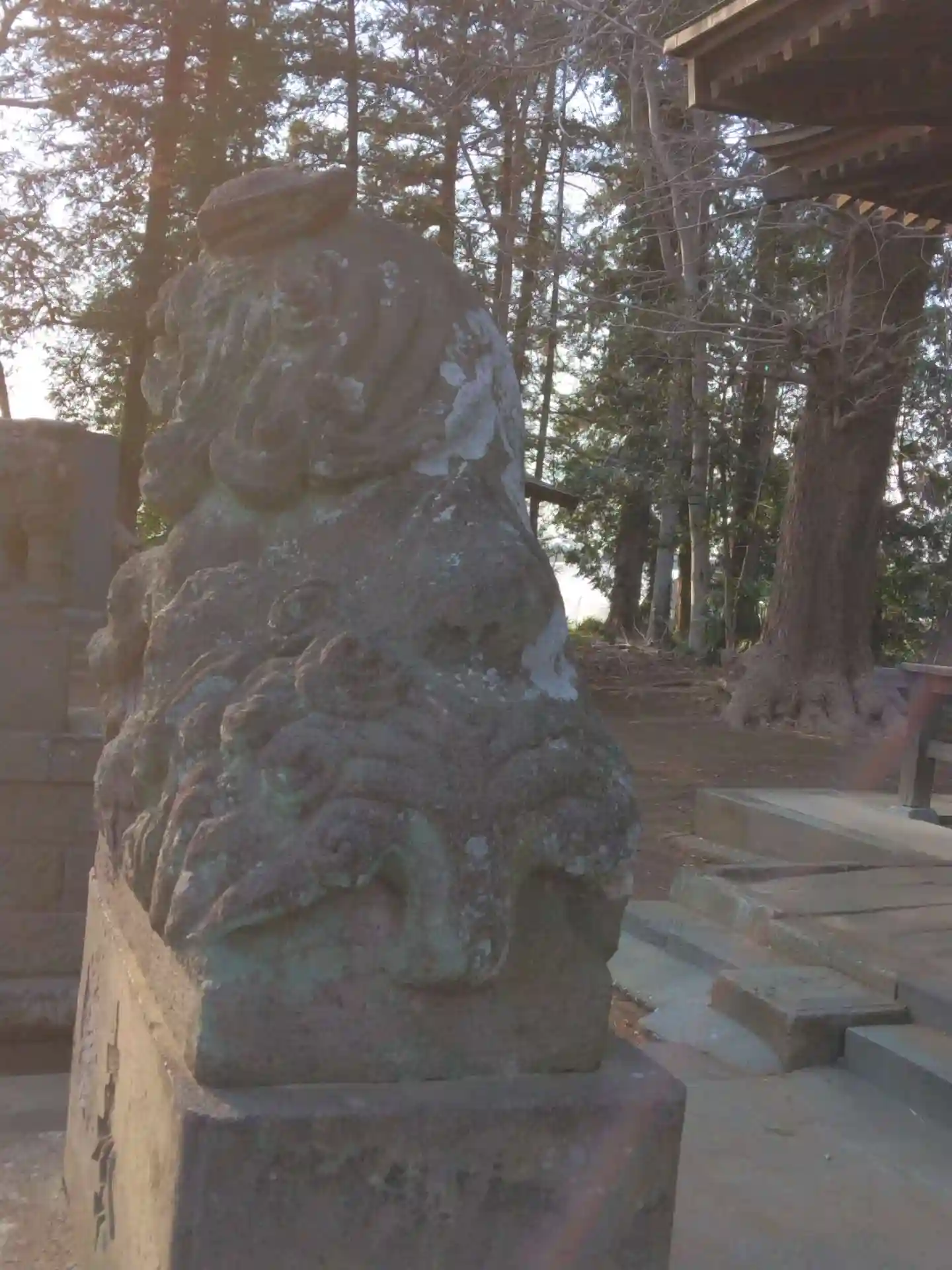 拝殿前の狛犬さん。「吽形」の方は球を抑えいます。