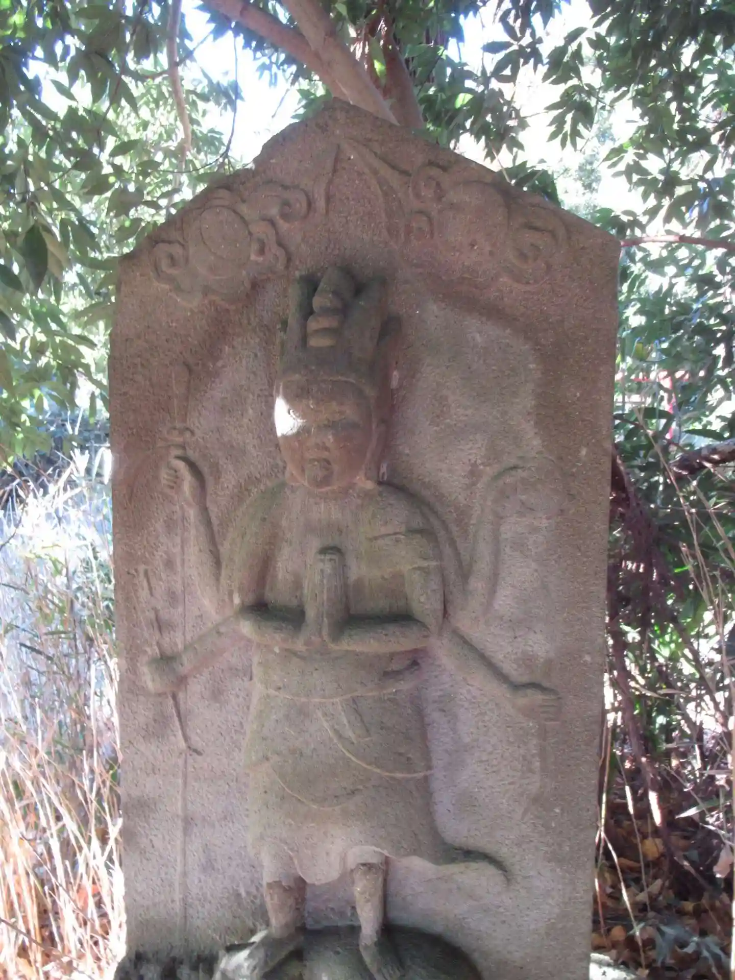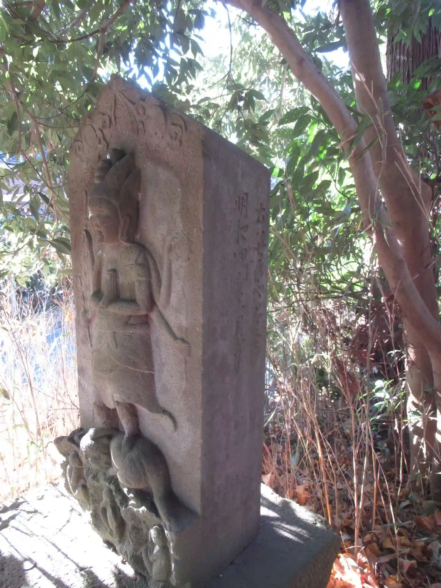 これを過ぎると、Y字のふたまた分かれ道にぶち当たり、お社たちの真ん前にお社を護るがごとく馬頭さんと庚申塔が直立。