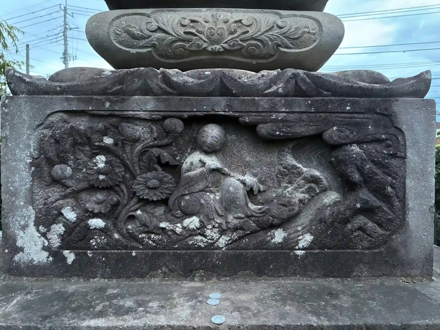 街道沿いにあるお寺。本堂前になぜか方位が示されていました。台座に菊慈童を彫り込んだ立派な宝篋印塔が…