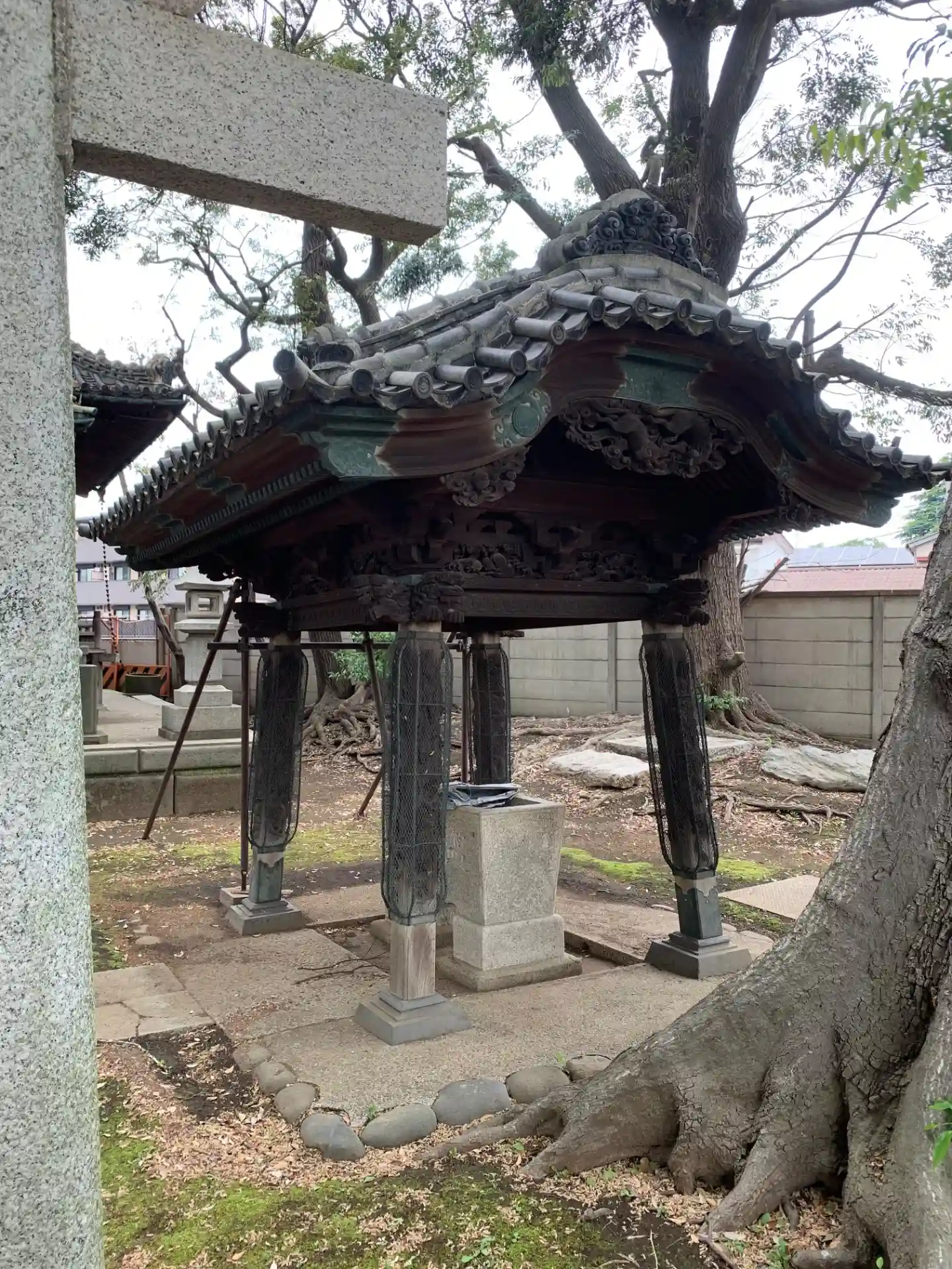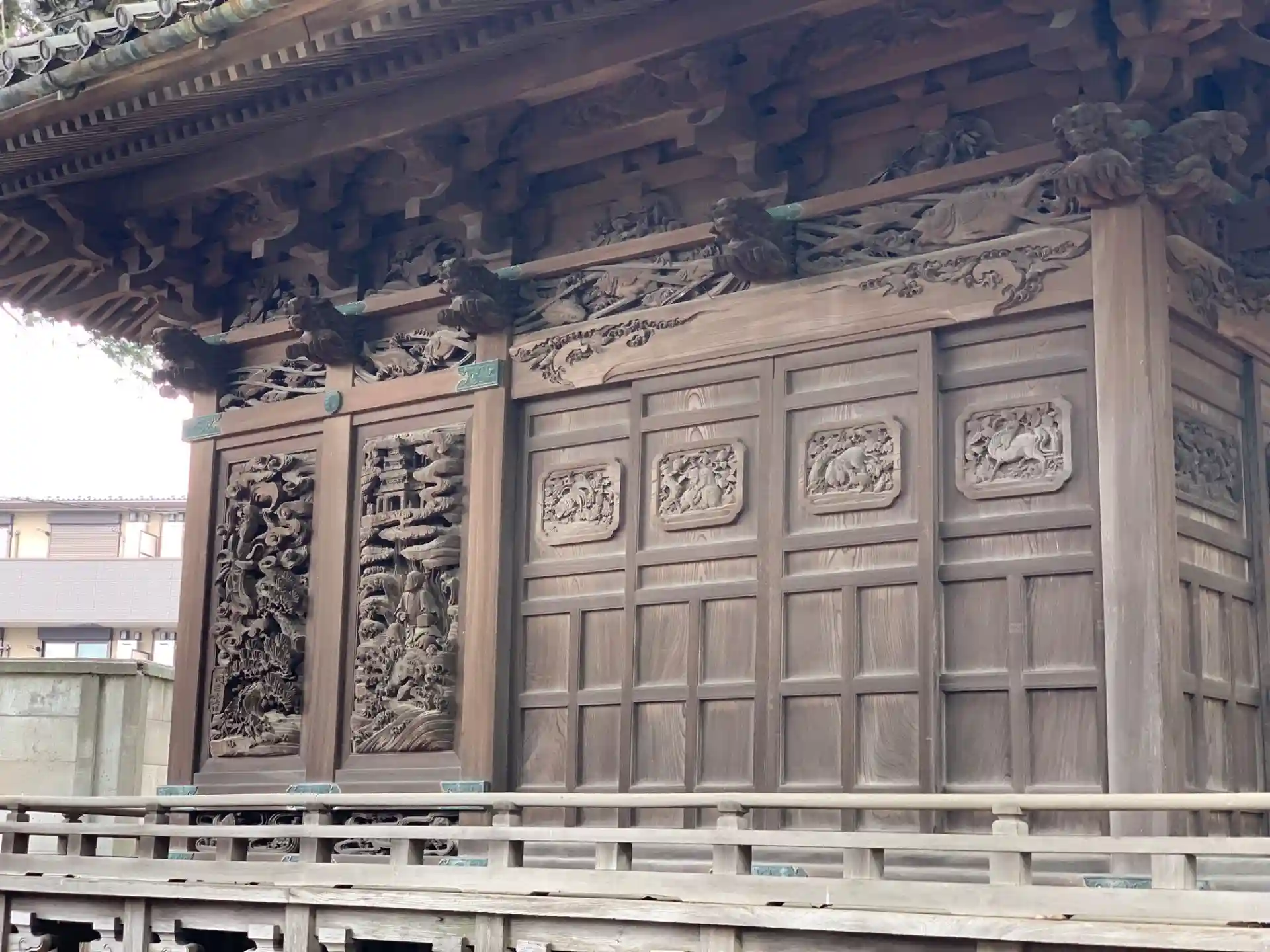キッコーマン創業家のひとつ、茂木家の屋敷が並ぶエリアにある神社。茂木家が祀っている神様という扱いのようで部外者は参拝できません。彫刻は立川流の佐藤里次が手がけたそうです。