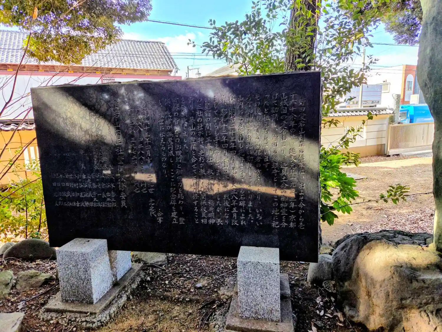 | ご由緒 | 野田開墾の後、火の災難を防禦せんが為、山城國愛宕郡愛宕(現在の京都市右京区)の里からこの地に、迦具土命の御分霊を遷奉りて氏神とした。時に延長元年(西暦923年)であります。迦具土命は雷神を祀り、防火を司る神様であります。依って野田郷開梱後、郷内に勢力を伸ばしはじめた土豪(農兵)等の間に争いなどがあり、山火事ばかりでなく兵火の心配も多く故に火伏の神を祀ったと伝えられています。