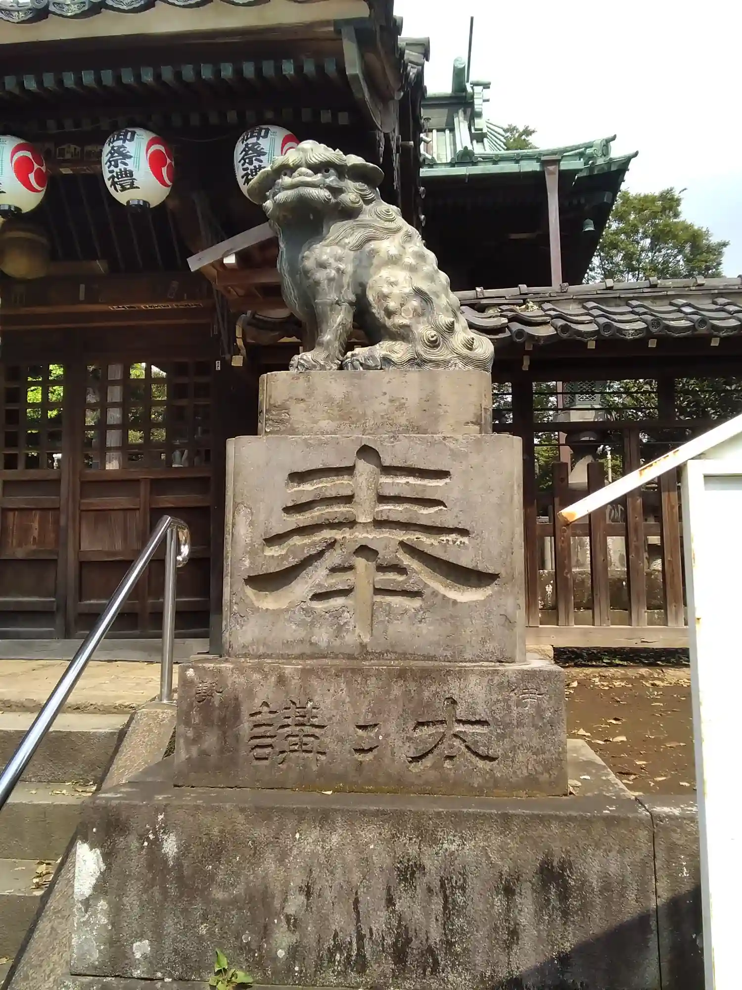 境内で遊ぶ子供を見守る狛犬さん