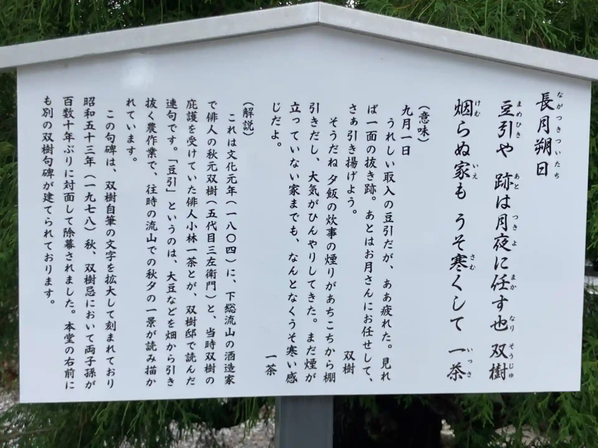 境内には見どころ満載。特に、俳人小林一茶と当地で彼を庇護した門人秋元双樹の交流を語る、一茶と双樹の詠んだ連句を記した石碑が残っている(発句は双樹)。秋元家は初めて味醂製造を手掛けた当地の豪商である。この句碑の除幕式には、一茶と秋元双樹双方の子孫が出席して執り行われたとの事。深いご縁を伺わせますね。
