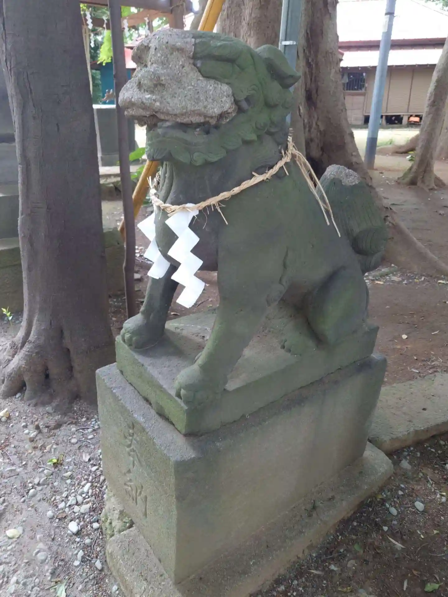 年季の入った狛犬さん。補修された後がわかります。アラレちゃんに出てくるDr.マシリトみたいです。(わからない方はぜひ調べてみてください。