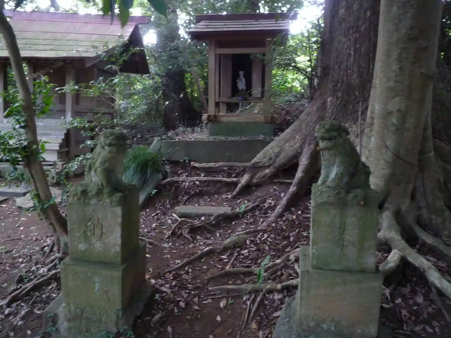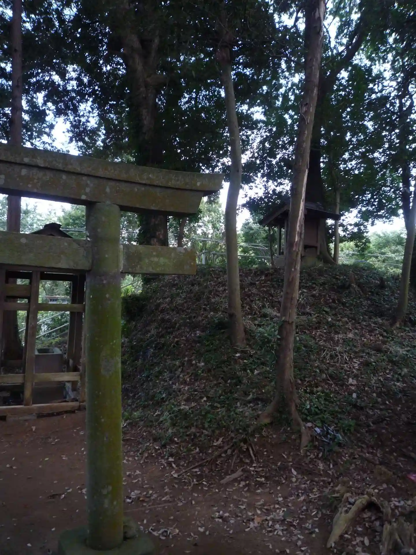 車道沿いに大きな木と鳥居が見えます。本殿は三柱の神を祀る簡素なお宮でした。