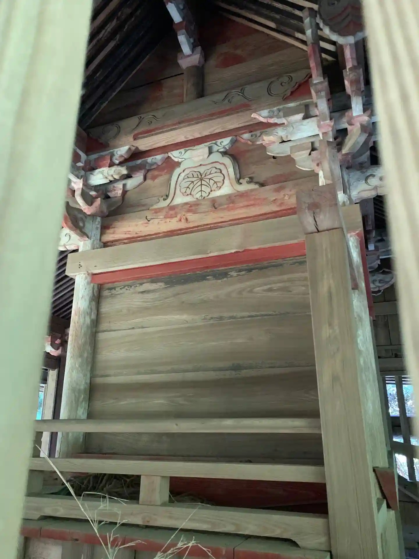 丘の上の開けた場所にある神社。拝殿と本殿がそこそこ離れています。覆屋の中にある本殿は褪せた朱色から古めかしさを感じます。
